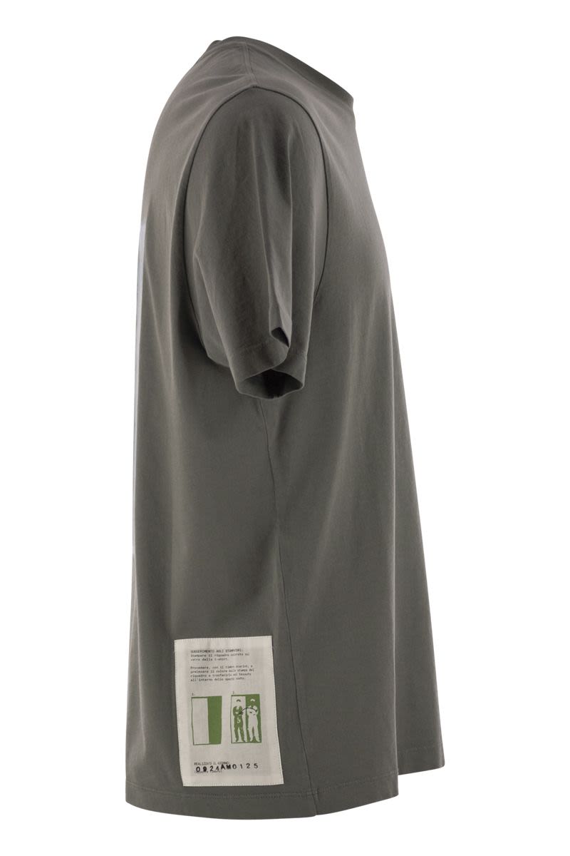 コットン24/1ジャージーのTシャツ。背中にはプリント工程を記した刺繍ラベル付き。フロントとバックにプリント入り。