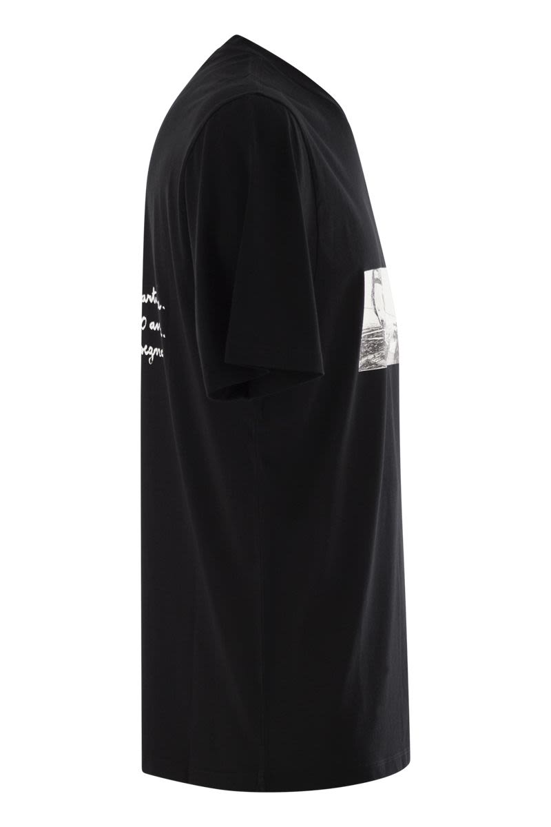 コットン24/1ジャージー製のTシャツ。フロントとバックにプリント入り。