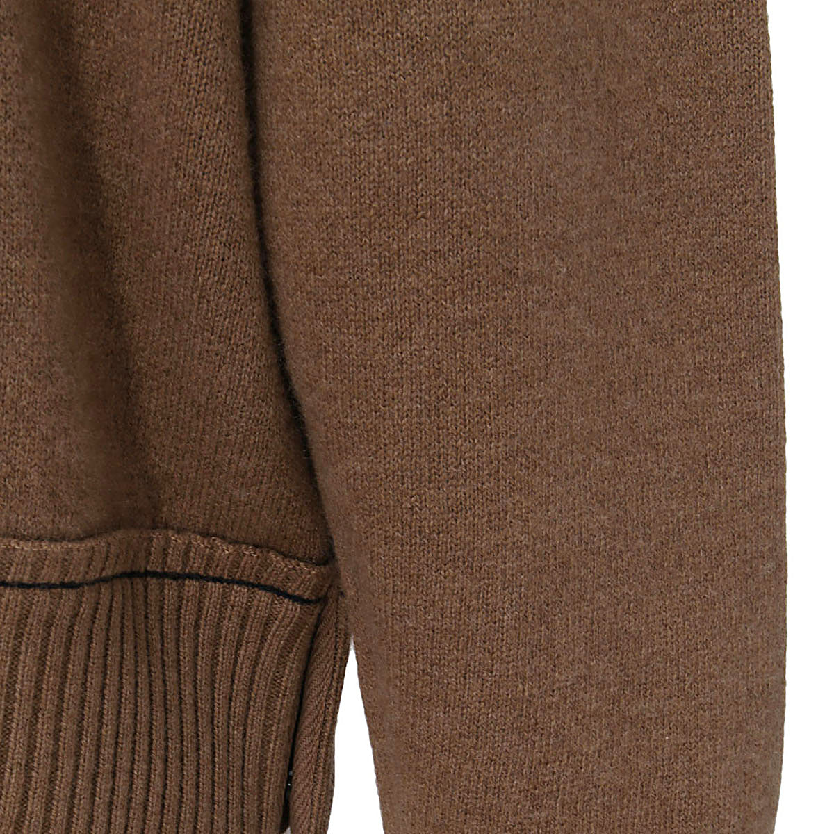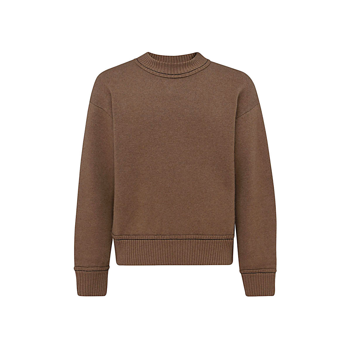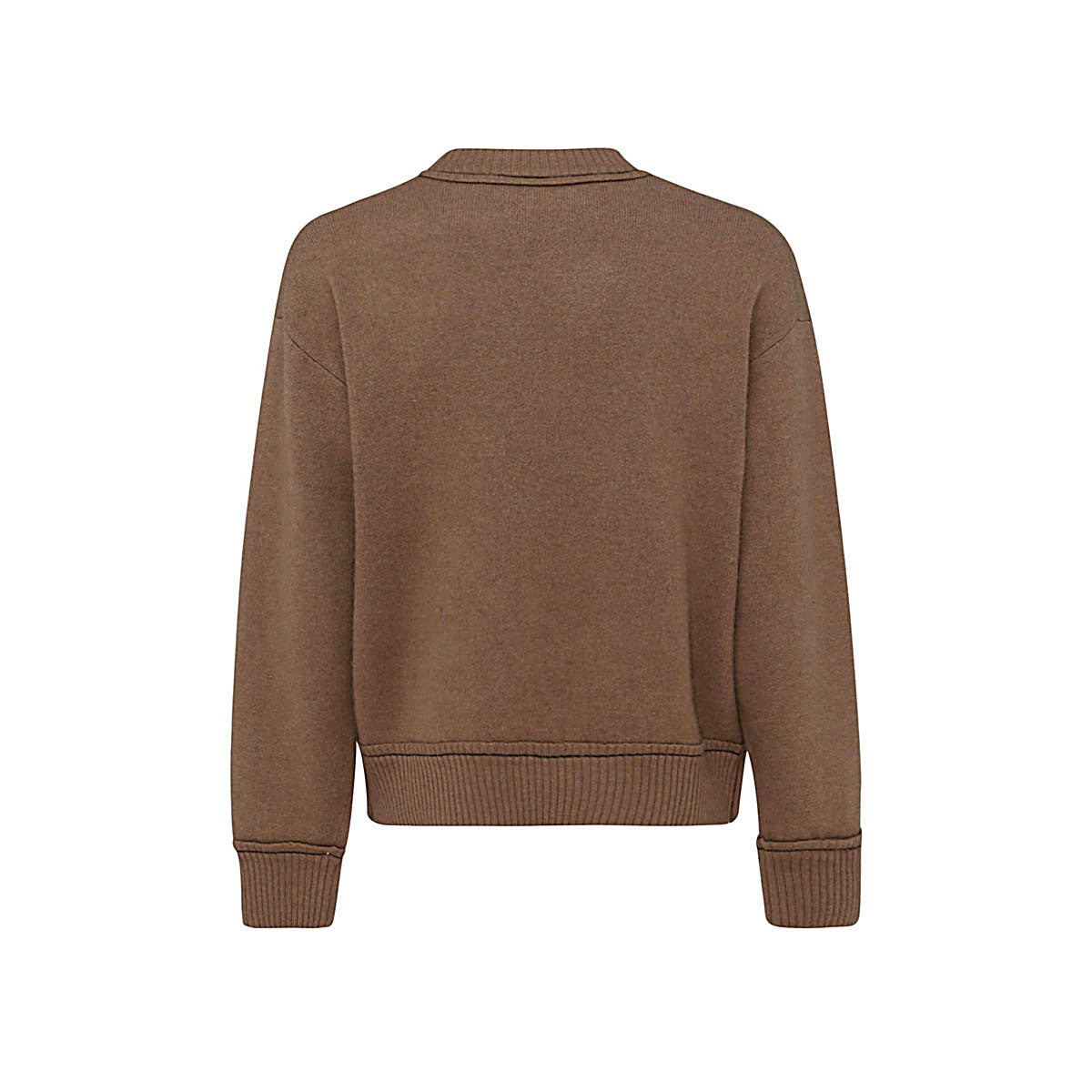キャメルブラウン、カシミア混紡、同系色のロゴプレート、クルーネック、リブニットエッジ、長袖、ストレートヘムが特徴です。