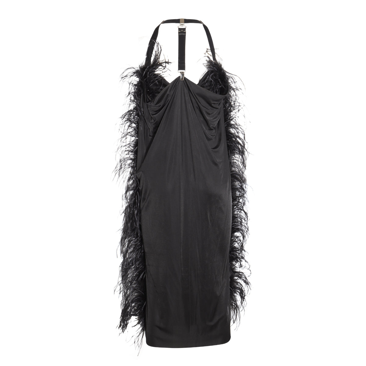フェザーのインサート、ホルターネックライン、バックの調節可能なストラップが特徴です。