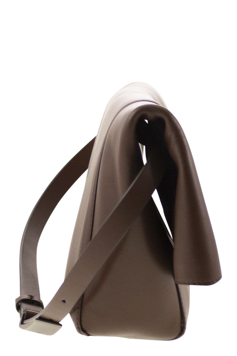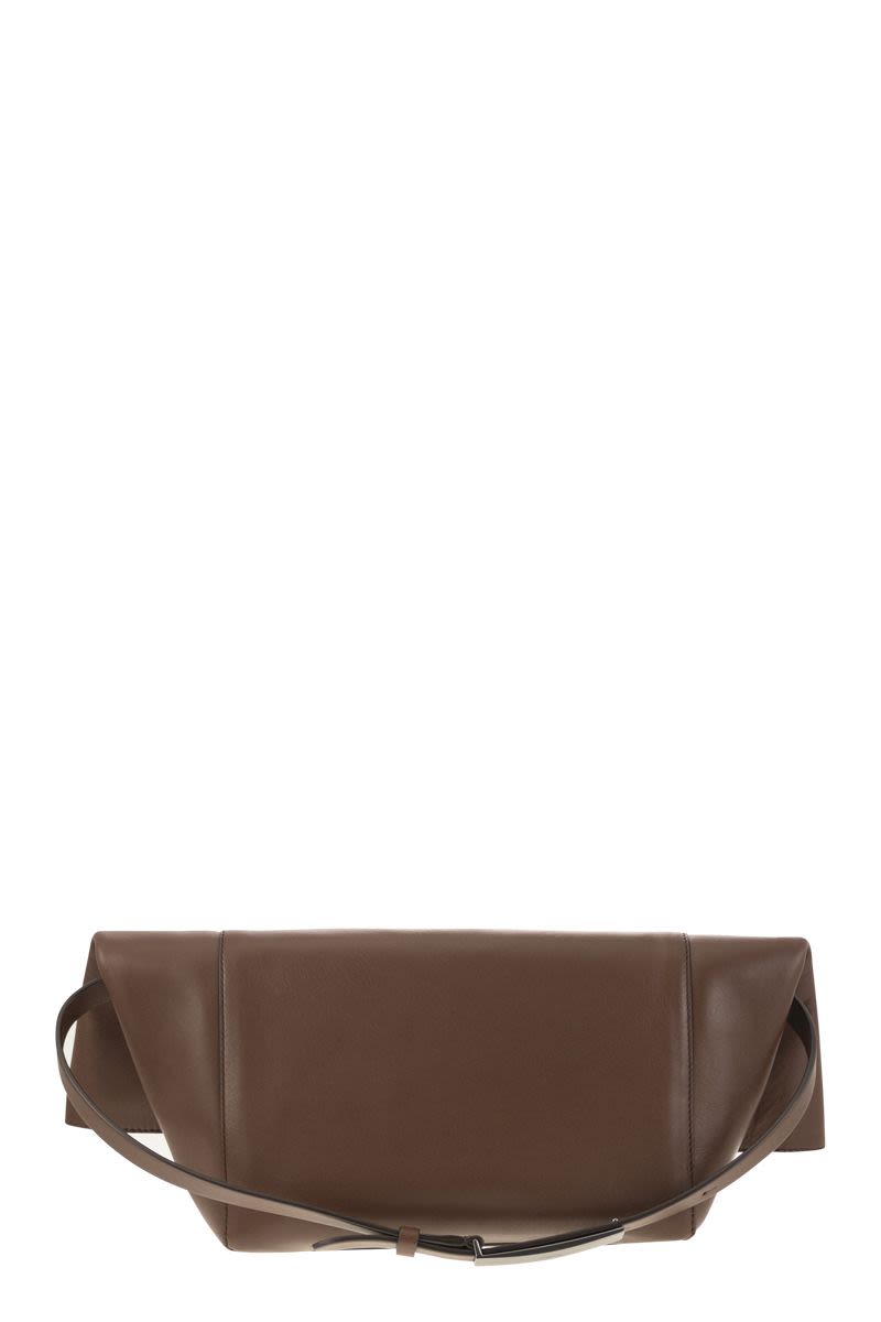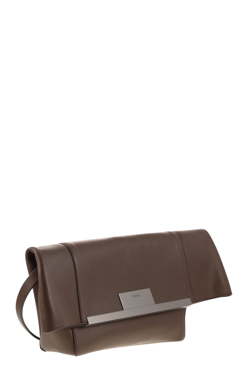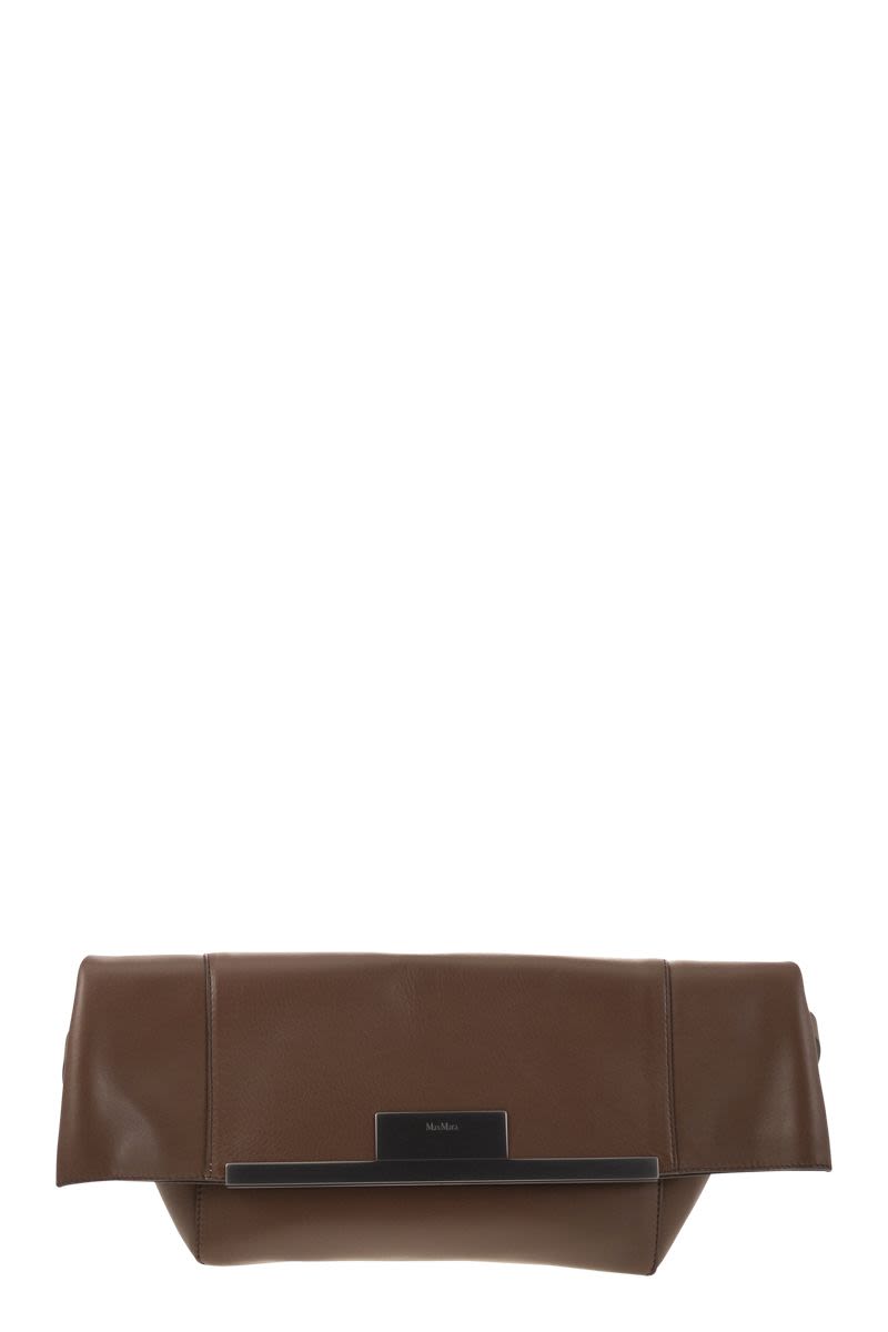 ソフトなナチュラルカーフレザーのスモールクラッチバッグです。メタルジッパー付きの折り返しデザインで、Max Maraのロゴプレートが刻印されています。内側はコントラストカラーのリネンの裏地付きで、レザーのフラットポケットが付いています。調節可能なショルダーストラップはメタルロゴ入り。