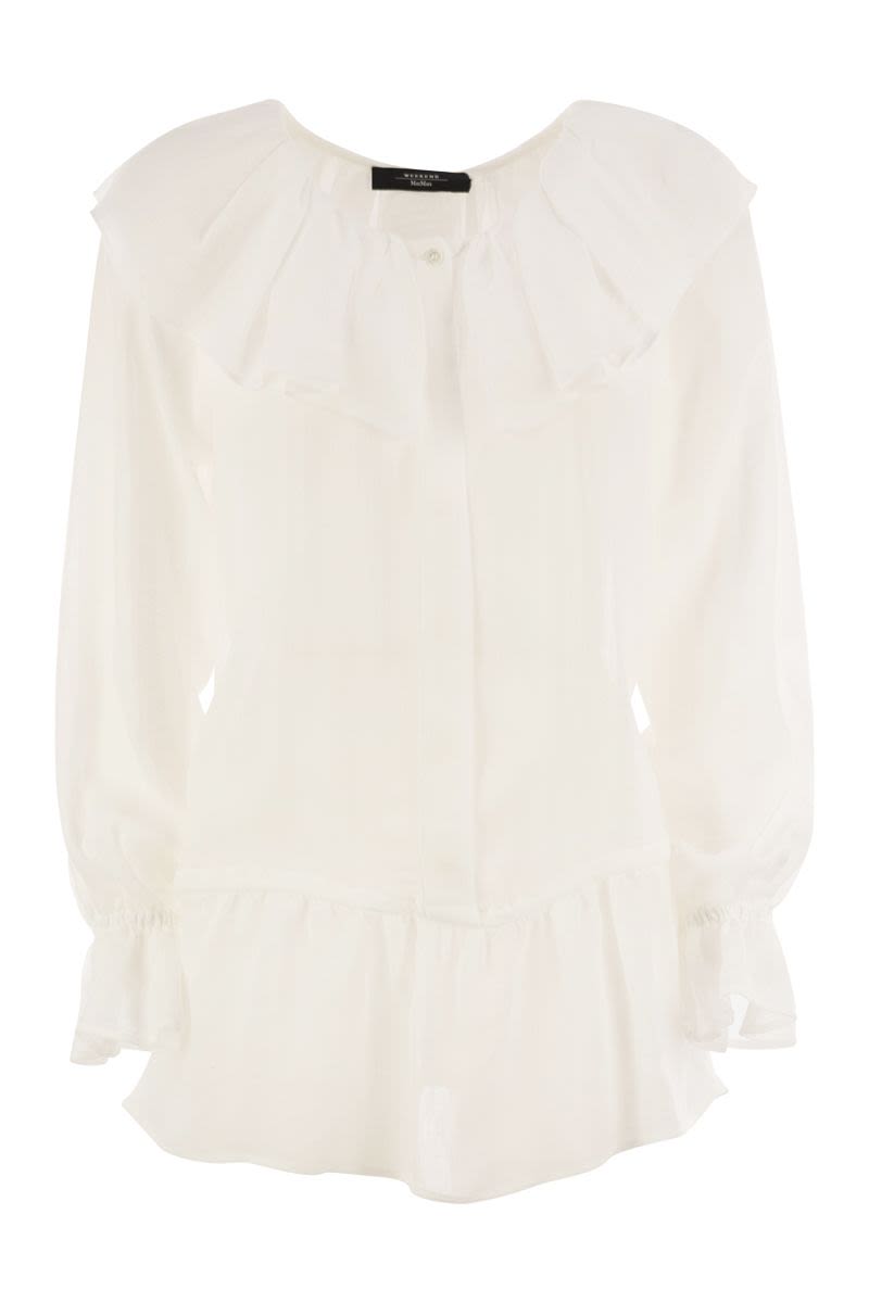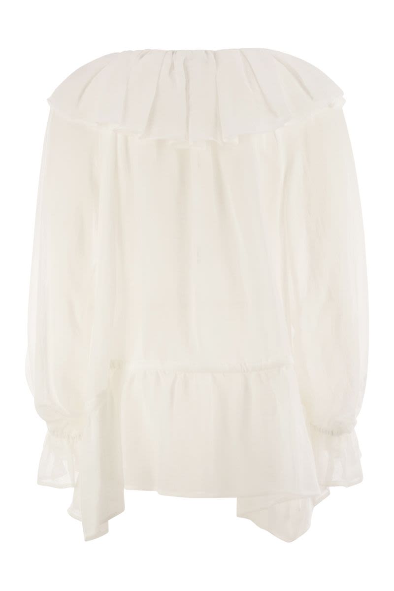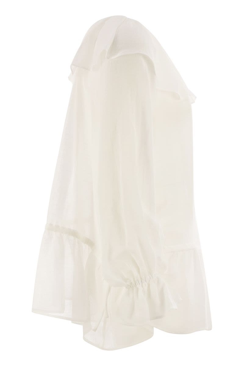 軽やかなリネン混ガーゼのロマンティックな長袖ブラウス。肩と袖に幅広のケープ襟をあしらったソフトなシルエットが特徴です。袖口はフリル、ウエストは低めのドローストリングで、裾にフラウンスモチーフがあしらわれています。フロントは隠しボタンで開閉。リビエラと1970年代の庭園にインスパイアされたカプセルコレクション「u2018Lost in the Garden u2019」の一部です。軽やかな素材、花柄、ナチュラルカラーで、ウィークエンド・ウーマンの自由な精神を称えるシーズン。
