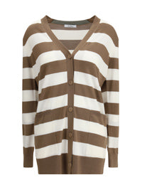 マックスマーラのフィーメ・カーディガンはピュア・バージン・ウールの糸を使用し、ダイナミックで個性的なストライプ柄が特徴です。長袖で、背中には「Max Mara」のロゴをあしらったフロッキー装飾が施されています。