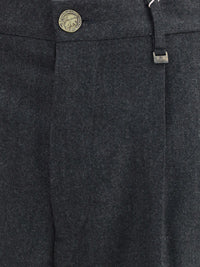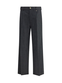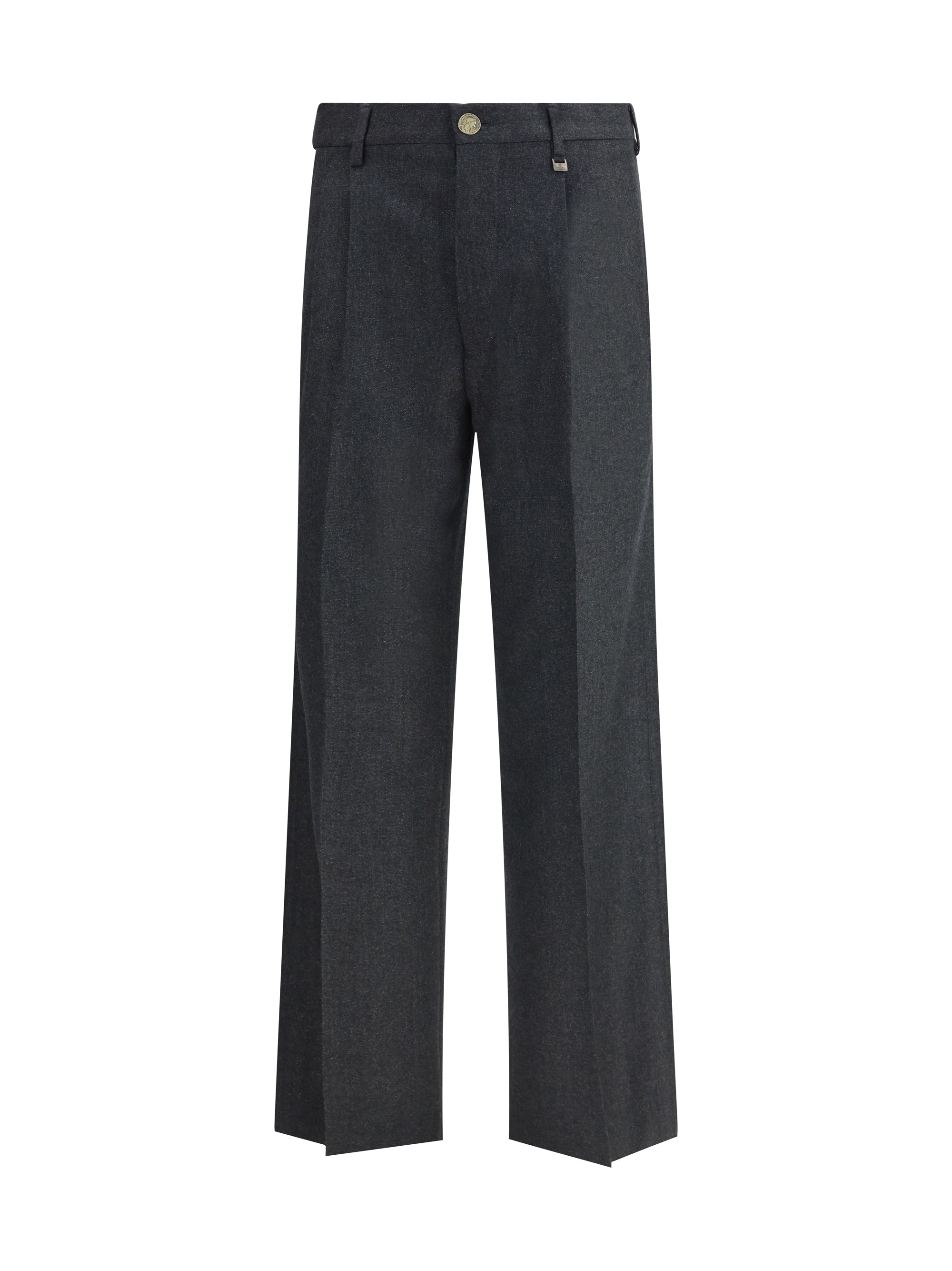 ヴィヴィアン・ウエストウッドのラファエル・パンツは、スタイリッシュなメタリック仕上げのソフトな起毛ウール製。ベルトループ付きのバンドとゴールドのボタン、ファスナーで開閉するハイウエストスタイル。ワイドレッグは洗練されたアイロンプリーツで強調され、サイドスリットとバックウェルトポケットがテーラードタッチのデザインを完成させています。