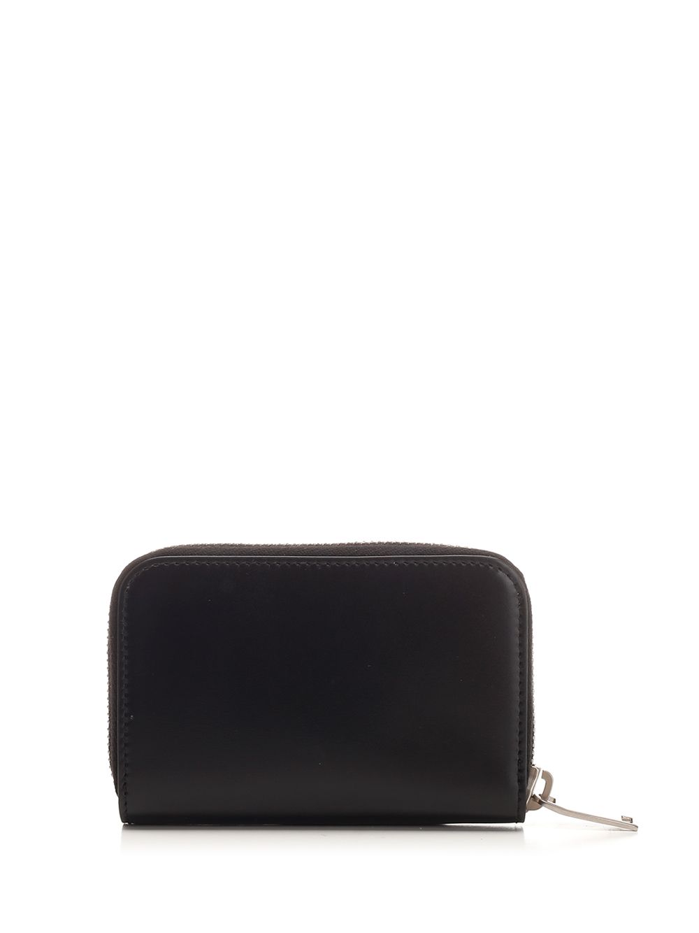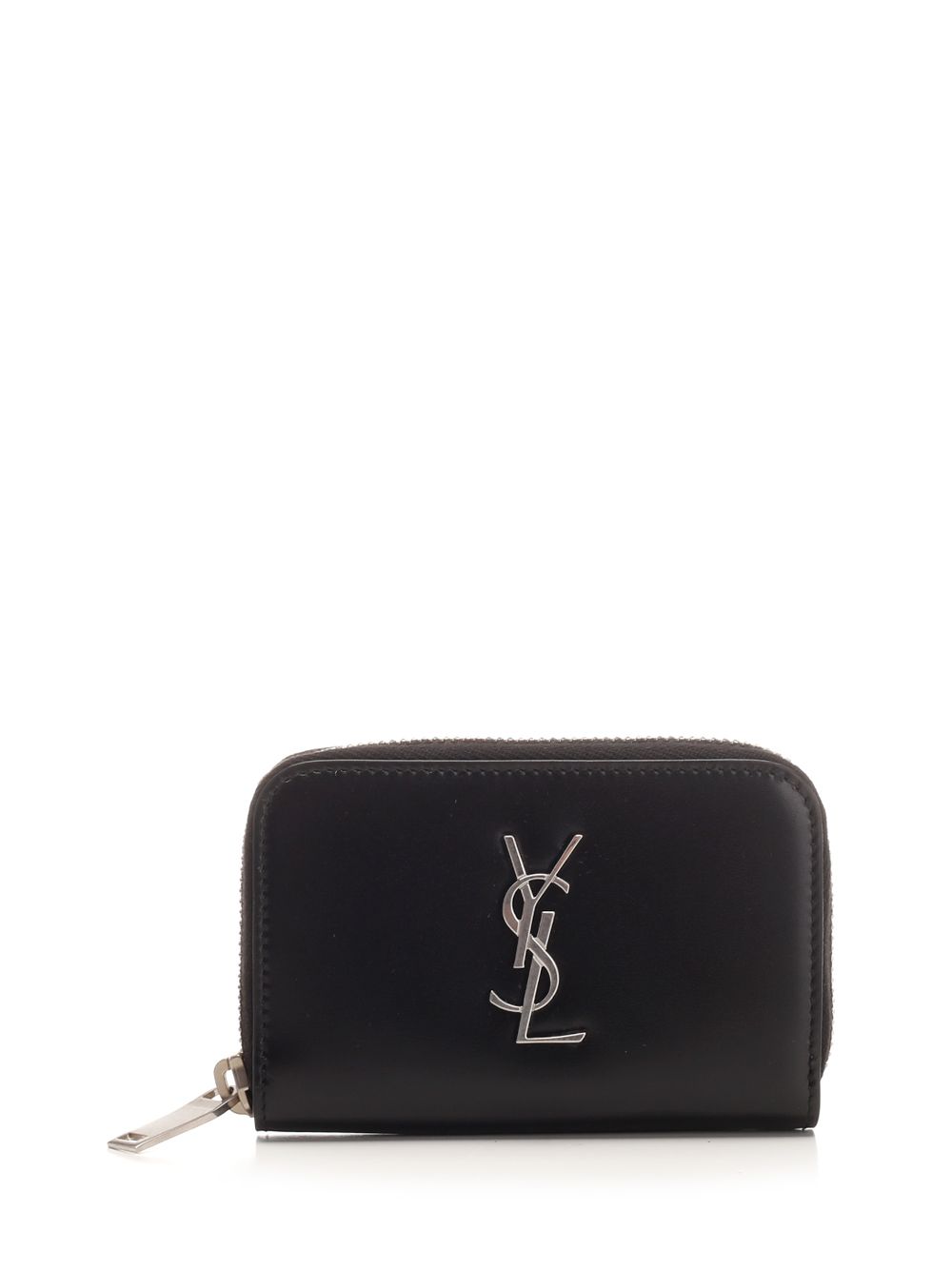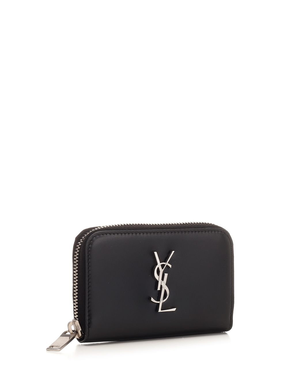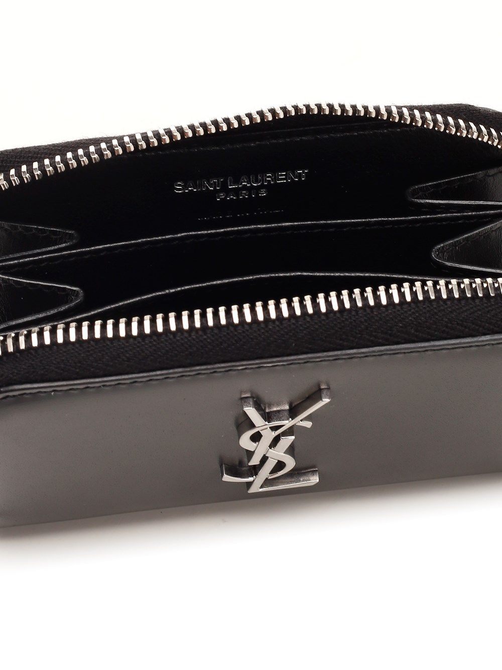 Black leather zip around wallet three internal compartments rhodium-plated metal YSL logo