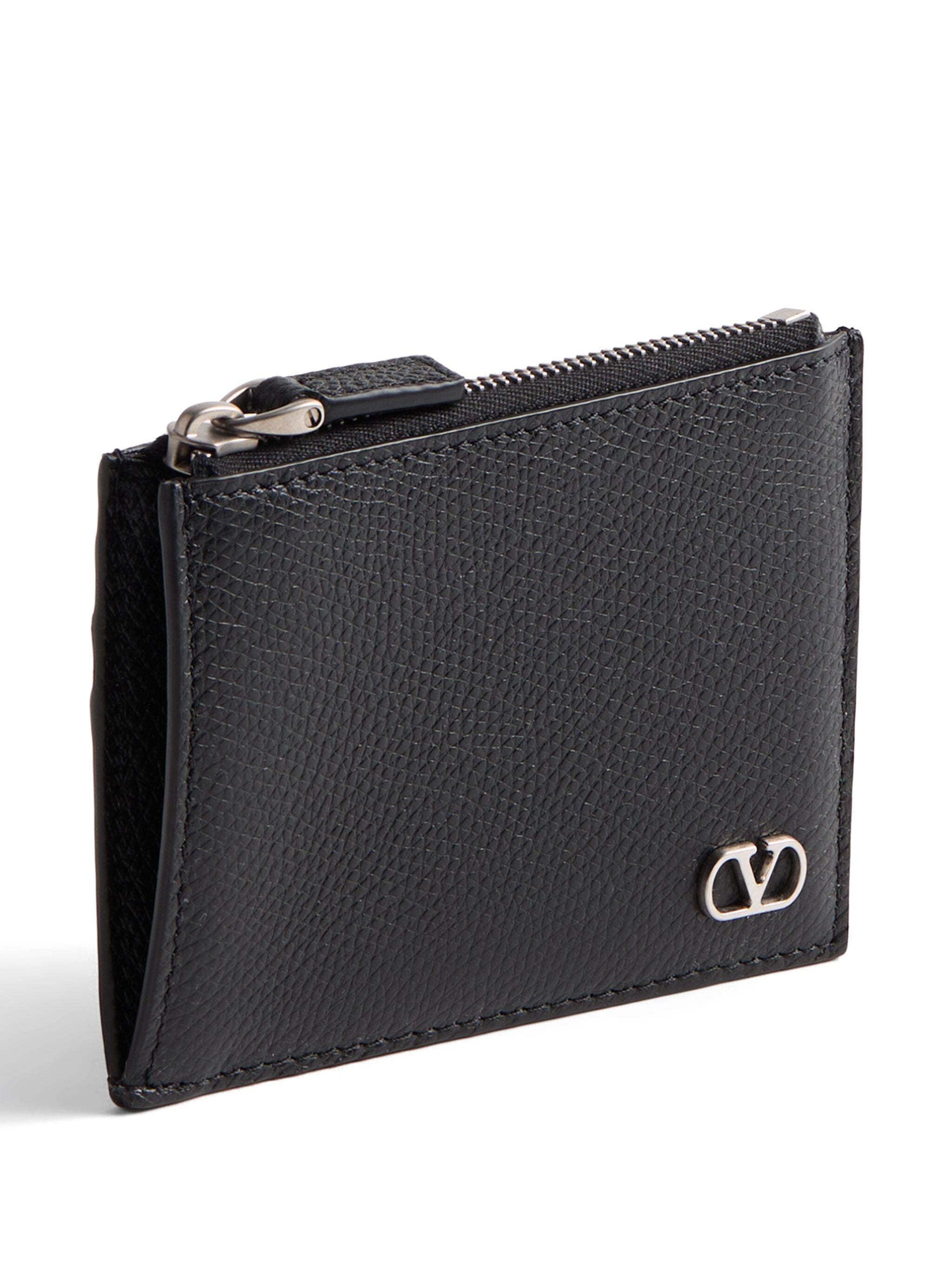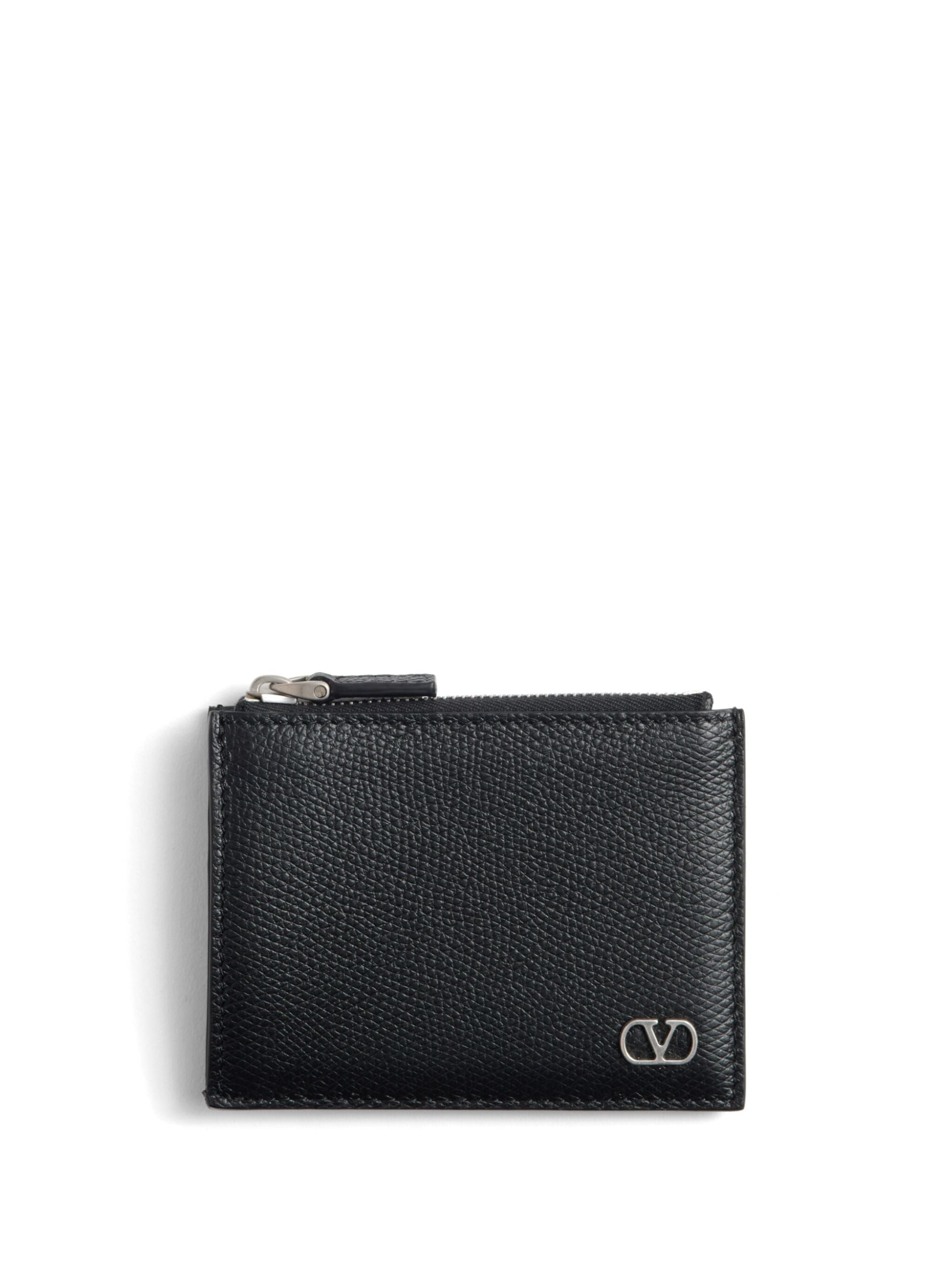 ブラック ラムスキン/カーフレザー Vロゴ シグネチャーロゴプラーク グレインテクスチャー トップファスナー 背面カードスロット