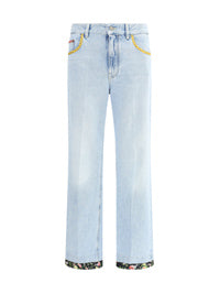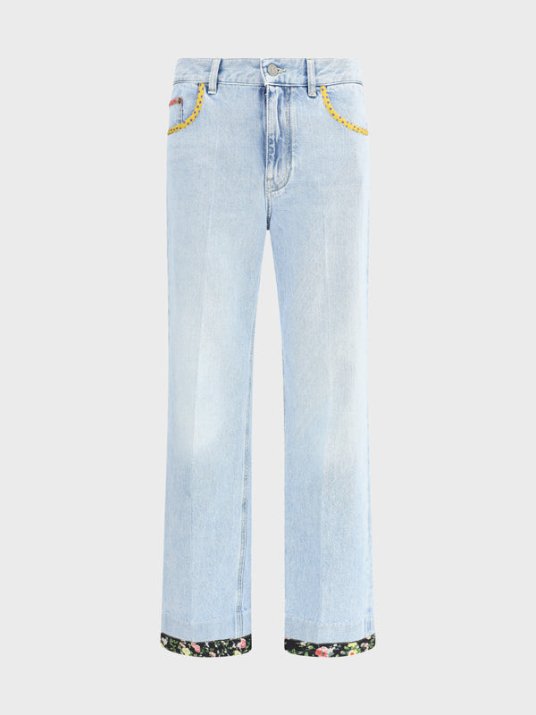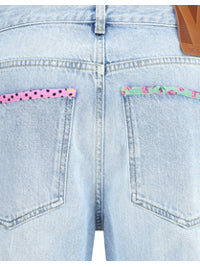 ヴァレンティノ フローラルエッジジーンズは、クラシックな5ポケットストレートカットに洗練された独創的なディテールを組み合わせました。フロントはジッパーとボタンで開閉し、ベルトループとポケットの水玉模様が実用的でスタイリッシュなアクセントを添えています。