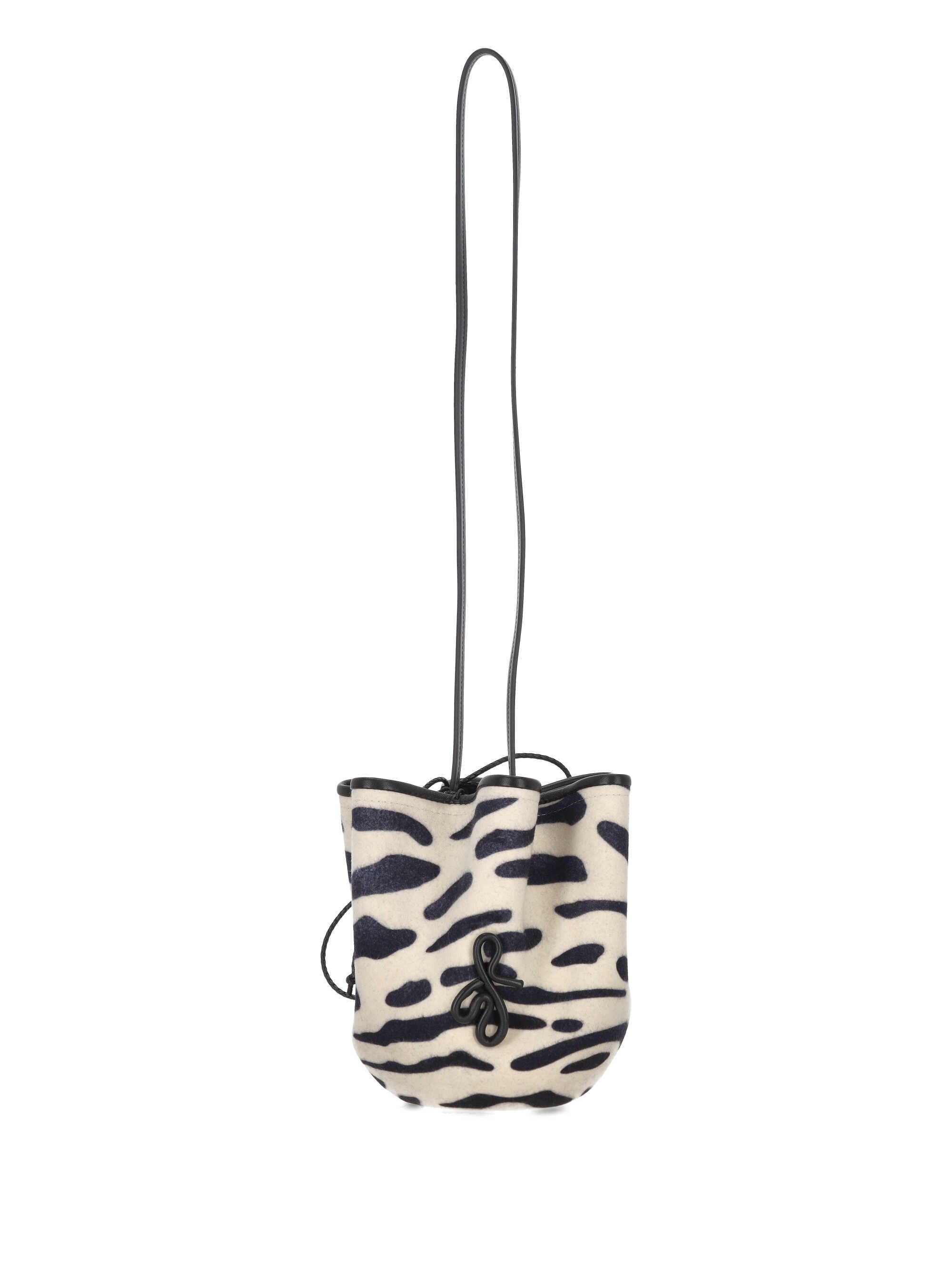 ブラック/ホワイトレザー アニマルプリント ドローストリングクロージャー シングルショルダーストラップ ロゴディテール バケツ型