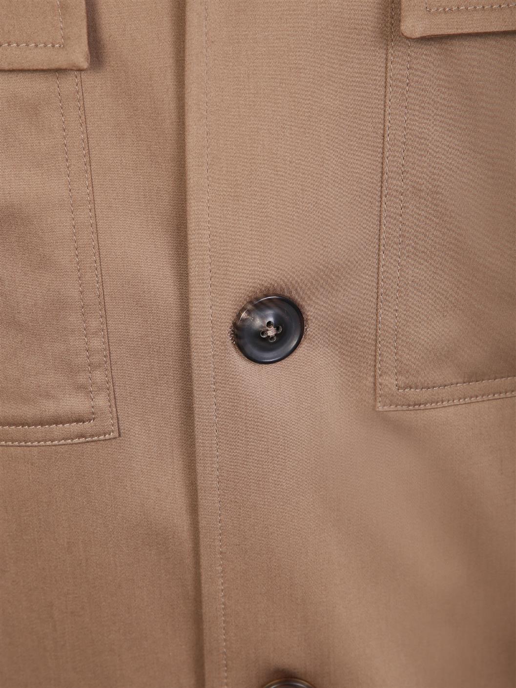 クラシックな襟。長袖。フロントボタン留め。両胸フラップポケット。ストレートヘム。カラー: ベージュ