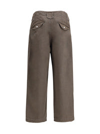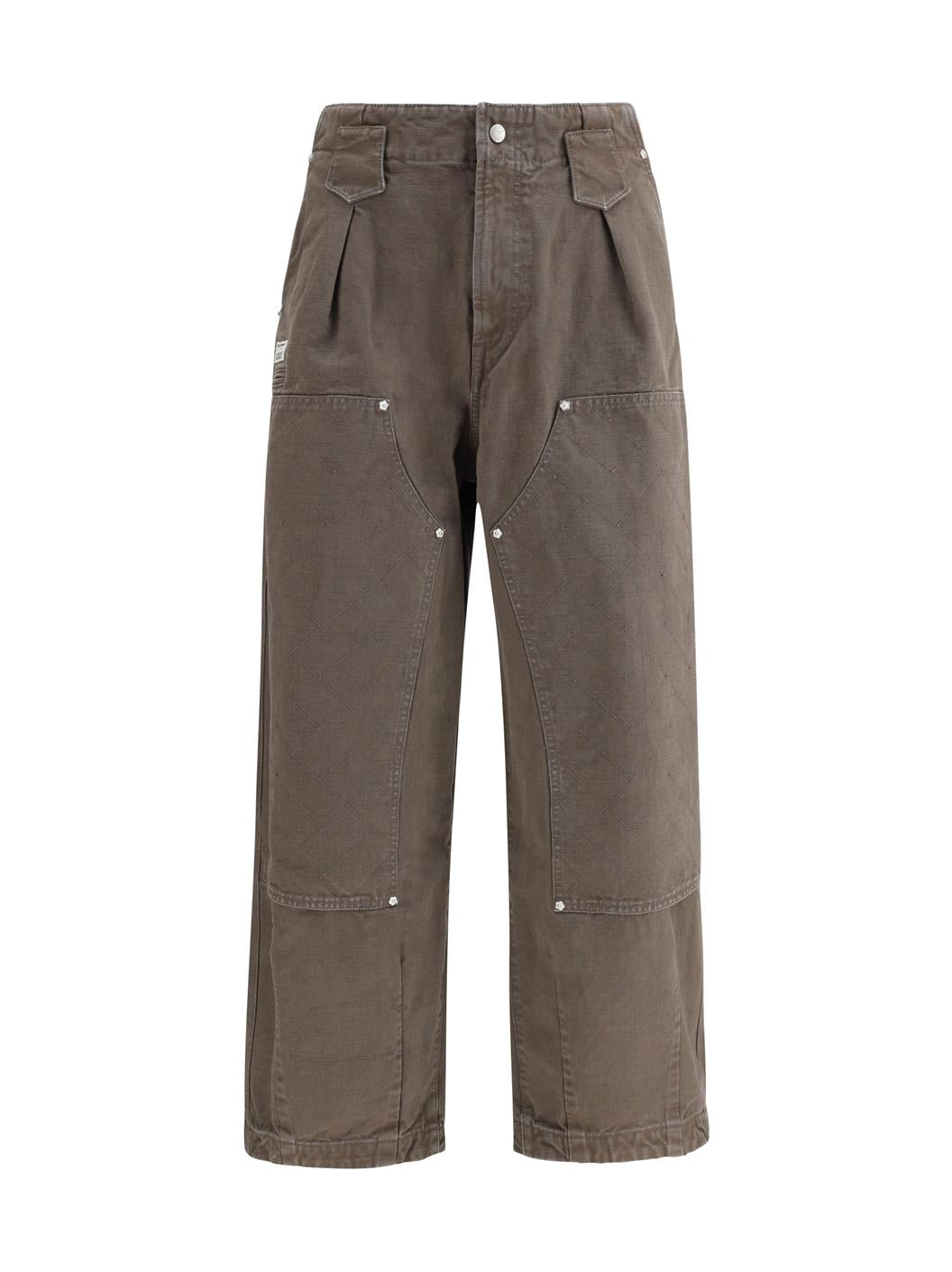 KENZOのコットンパンツは、膝に不規則な「KENZO Weave」ステッチをあしらったダブルニーデザインが特徴。ウォッシュ加工を施したコットン製で、フロントはボタンとファスナーで開閉、両サイドにポケット、フロントとバックにウェルトポケット、バックにはボタンポケットが2つ付いています。機能性と個性的なスタイルが融合したKenzoのシグネチャーです。
