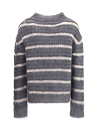 マルニのウールモヘアセーターは、快適な着心地と独特のグラフィックタッチのスタイルを兼ね備えています。リブ編みのクルーネック、袖口と裾が特徴で、鮮やかな横縞模様とレギュラーフィットが、カジュアルでありながら洗練されたスタイルにぴったり。