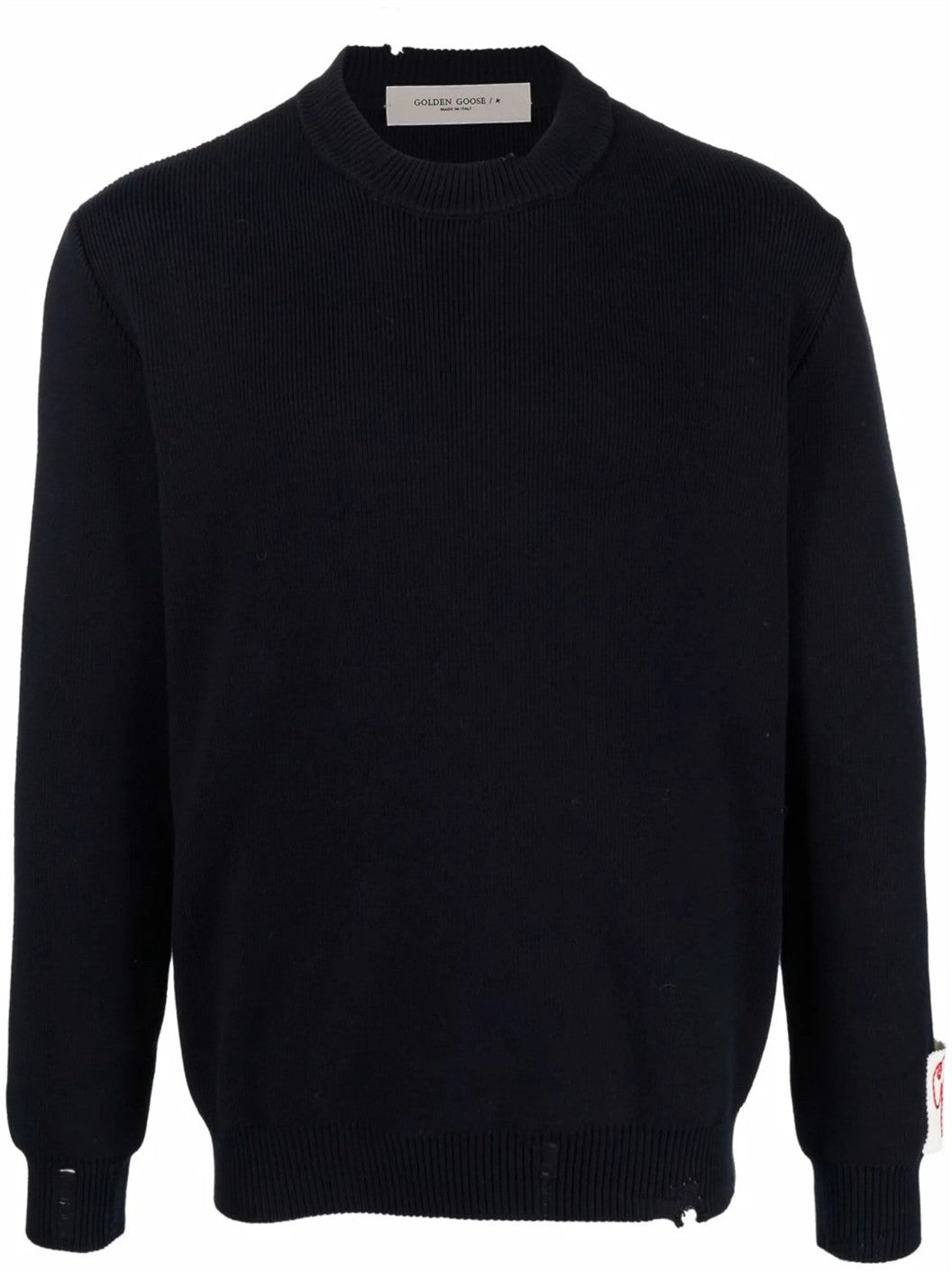 ブルーコットン混ストレッチコットンリブディテールクルーネック長袖