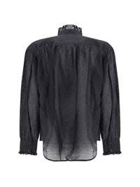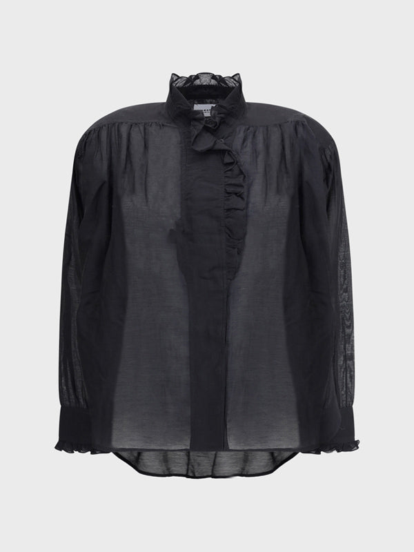 マラン・エトワールのパミアス・ブラウスは、エレガントで洗練されたデザイン。軽やかなコットンボイルにフリルをあしらい、ロマンティックで躍動感のあるデザインに仕上げました。アシンメトリーな襟と肩のインサートが特徴的で、デザインにオリジナリティを加えています。長袖は洗練された雰囲気を醸し出し、アシンメトリーな隠しボタンの前立てはすっきりと流れるようなラインを保ちます。ラッフルの縁取りがさらに個性を引き立て、ストレートカットが快適で多彩な着こなしを可能にし、シックでカジュアルなルックに理想的です。