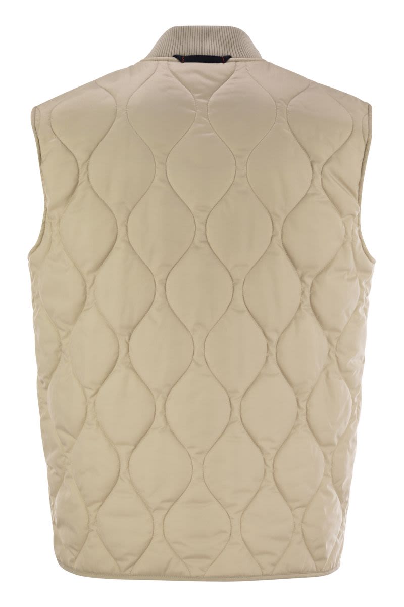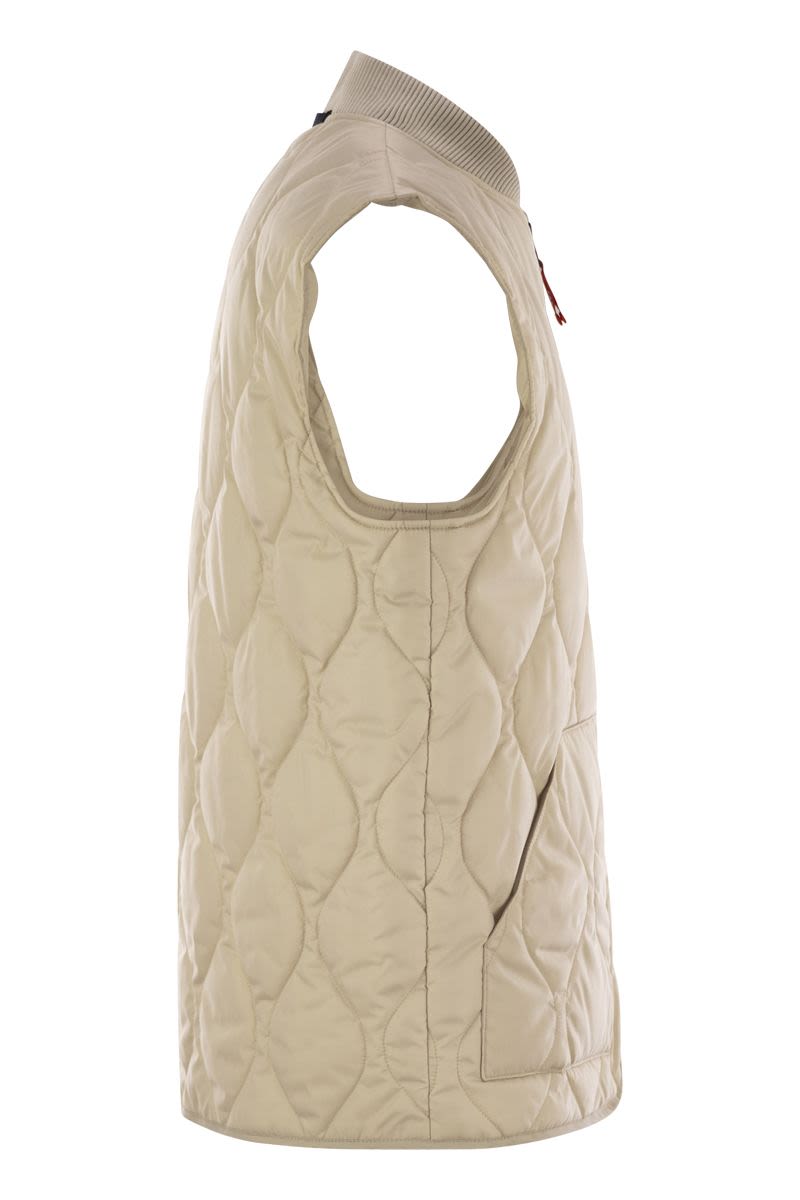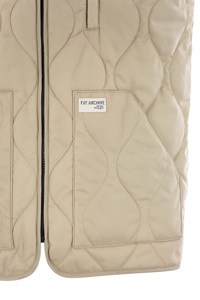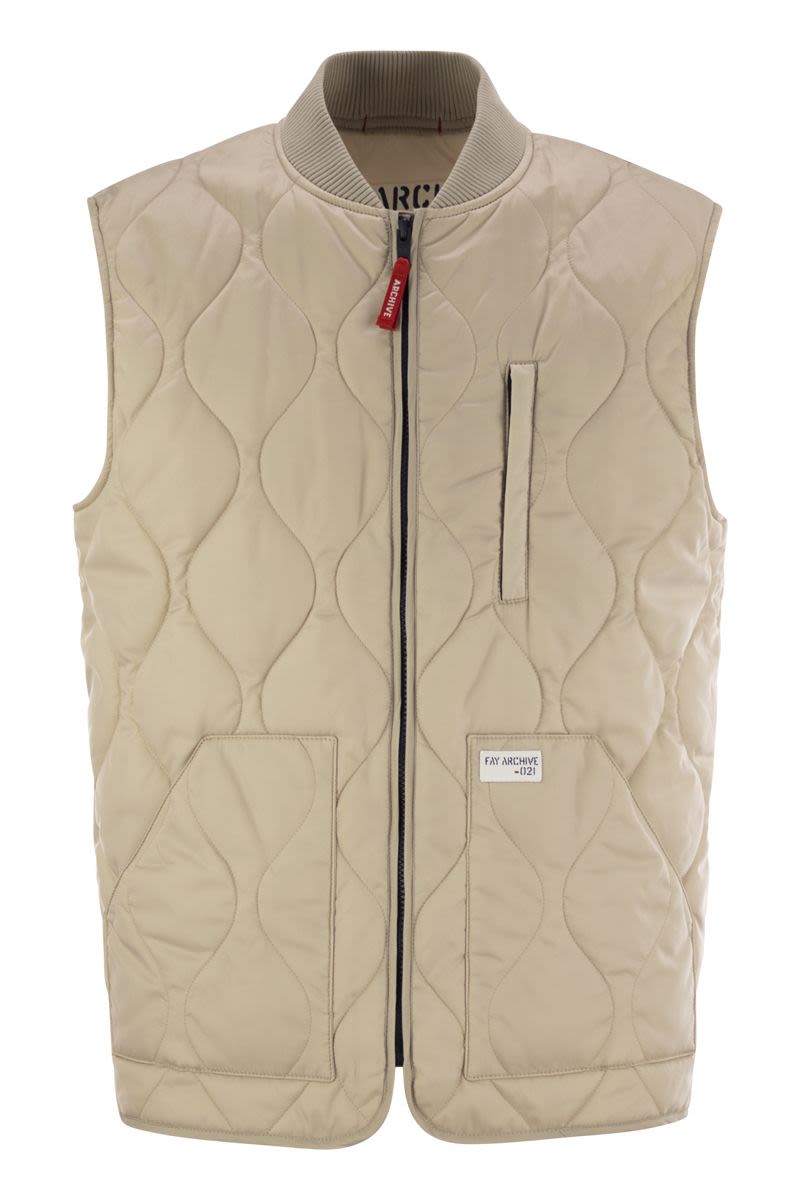 撥水加工を施したナイロン製ウエストコート。玉ねぎ柄のキルティングを施し、テクニカルな中綿入り。ボマー風のジャージー襟とプラッシュカットのポケットが特徴。左ポケットにFay Archiveのラベルが縫い付けられている。