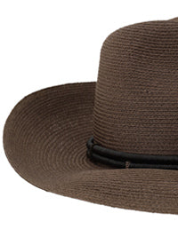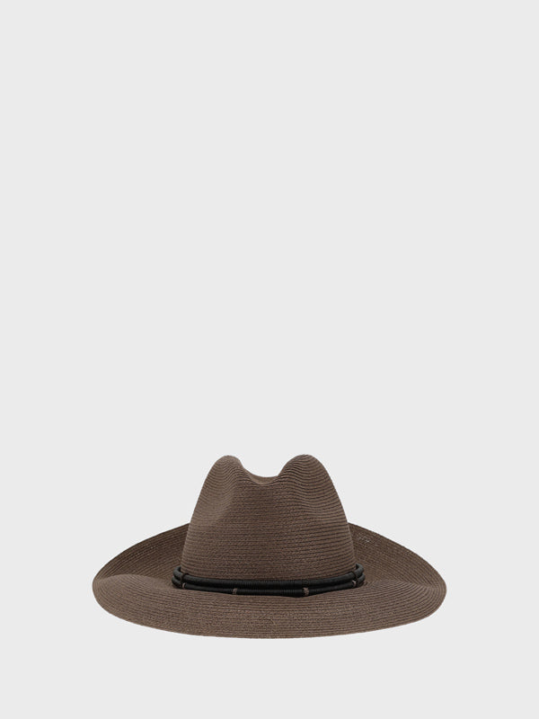 ブルネロ・クチネリの麻とテクノコットンを使用したフェドラ。レザーバンドとアイコニックなシャイニービーズが、デザインにエレガンスと軽やかさを添えています。洗練されたディテールと上質な素材が上品なスタイルを完成させる。