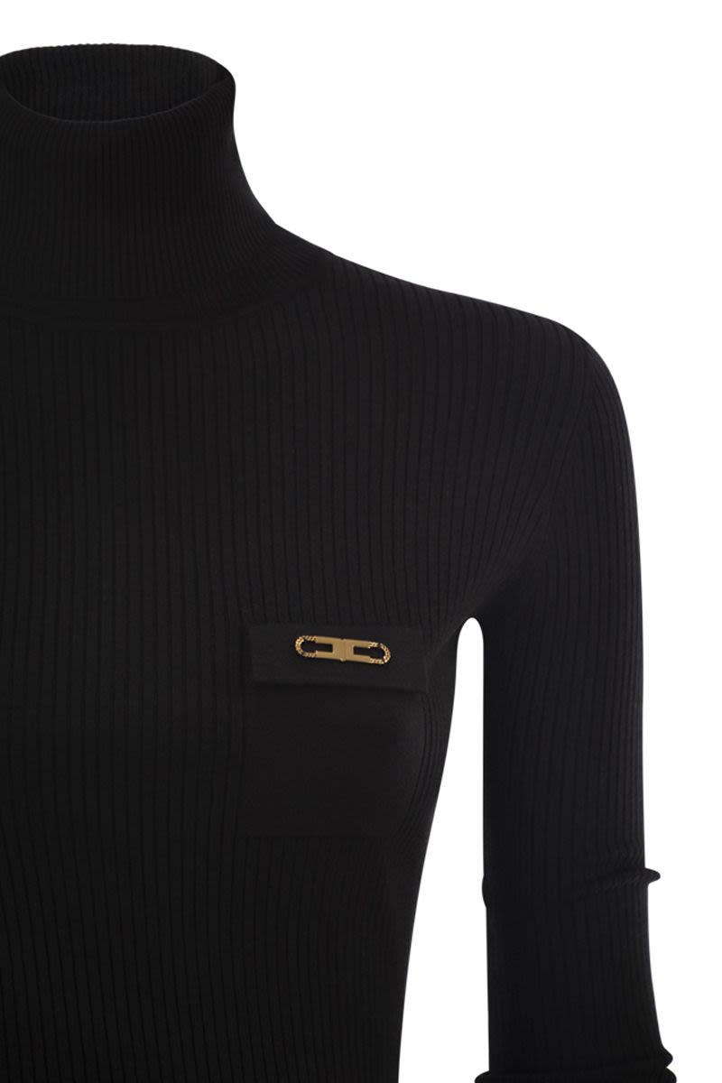 スリムフィットのリブニット。タートルネックと袖口にボタンがあしらわれた袖が特徴。ロゴのディテールが施されたサテン地のポケットが輝きを添えています。