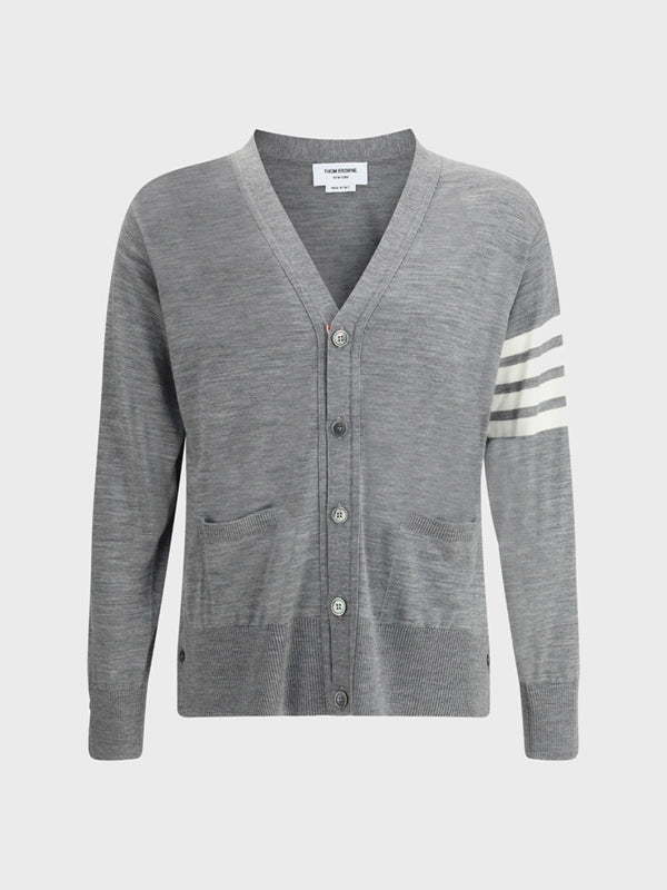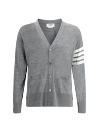 Thom Browneのフリースウールカーディガン。袖口はストライプ柄(ボタン付き)、裾はリブ編みでサイドスリットはボタンで調節可能。