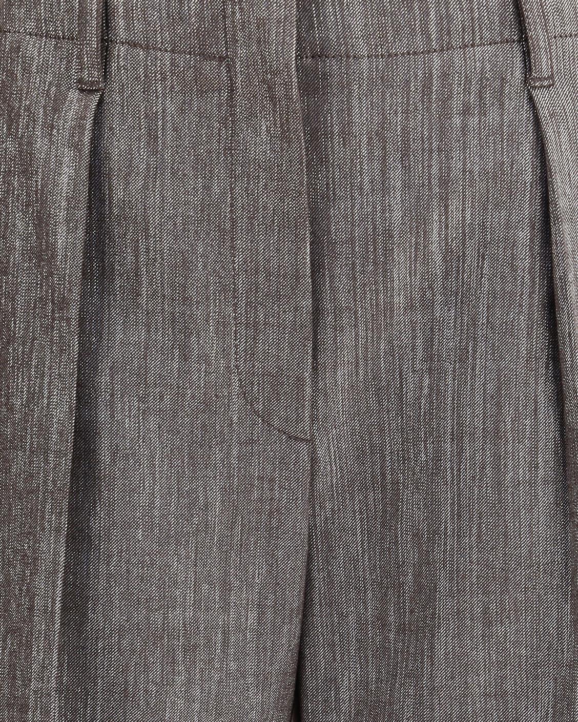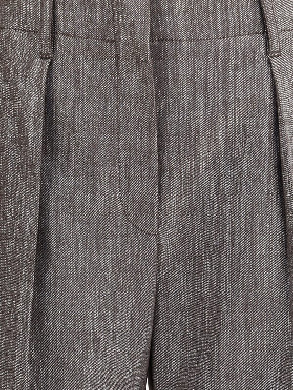 ブルネロ・クチネリのルレックス・エフェクト・パンツは、エレガンスと明るさを兼ね備え、洗練された個性を放ちます。ファスナーとホック開閉が特徴で、繊細なプリーツのディテールがシルエットを引き立てます。フロントのアメリカンポケットとバックのウェルトポケットが、クラシックで完璧なスタイルを完成させている。