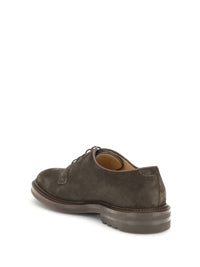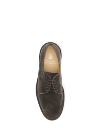 ブルネロクチネリのレザーレースアップシューズは、ソフトなスエードのデザイン、レースアップのフロントファスナー、レザーのブロックソールが特徴です。コントラストカラーのロゴ入りインソールが、個性的で洗練されたディテールを添えています。