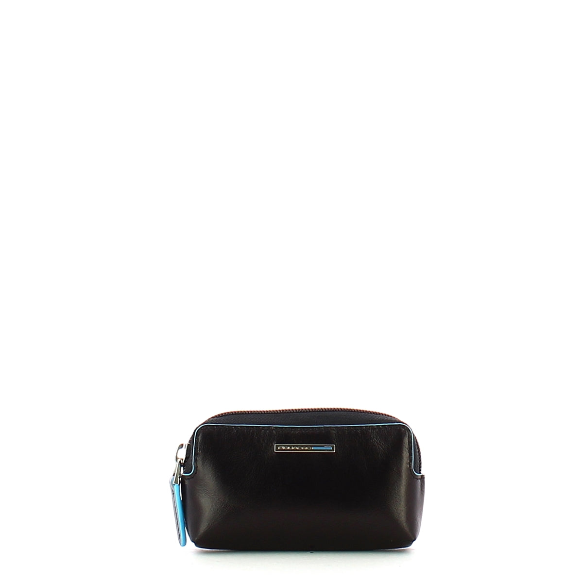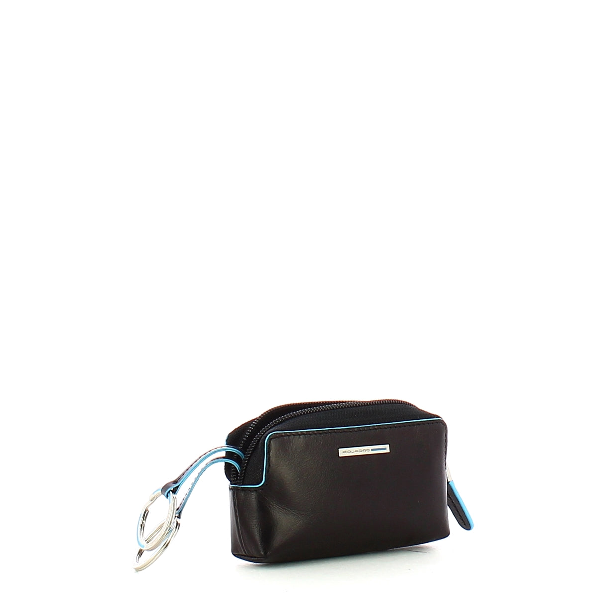 ブルースクエアキーホルダーポーチ。コンパクトなレザーアクセサリーで、背面にポケットとジッパー開閉のメインコンパートメントがあります。長さCM 12.0.高さCM 6.0.奥行きCM 3.0