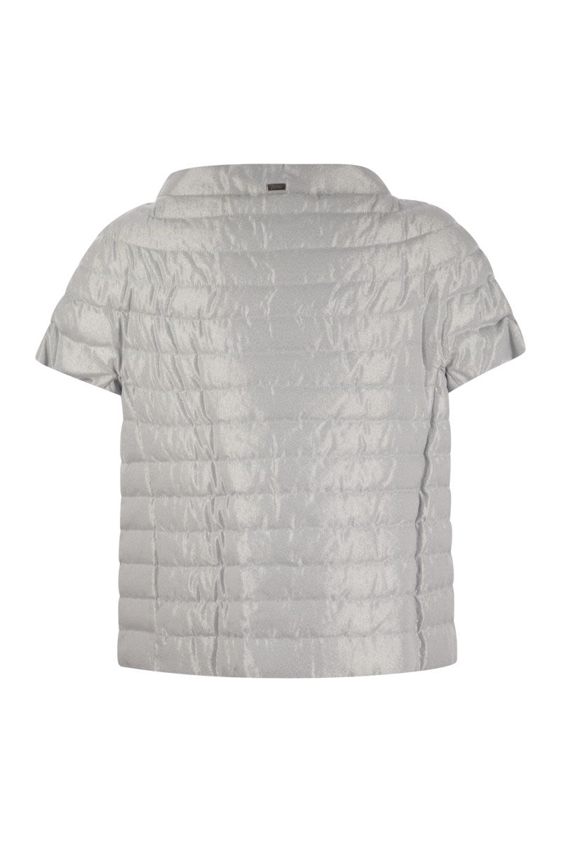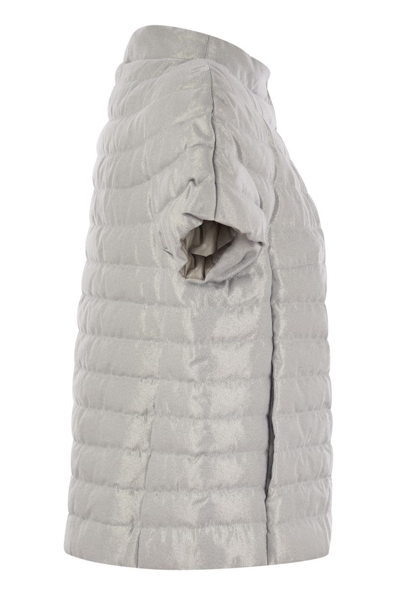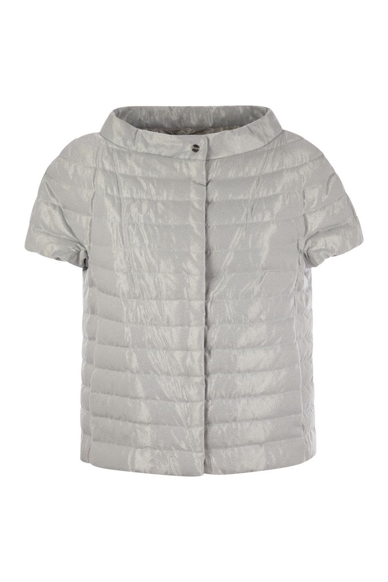 メタル効果のあるビスコース混紡素材を使用した、紛れもないヘルノ・スタイルの半袖ケープ。上質なグースダウンをインジェクション成型した中わたを使用し、非常に軽量。