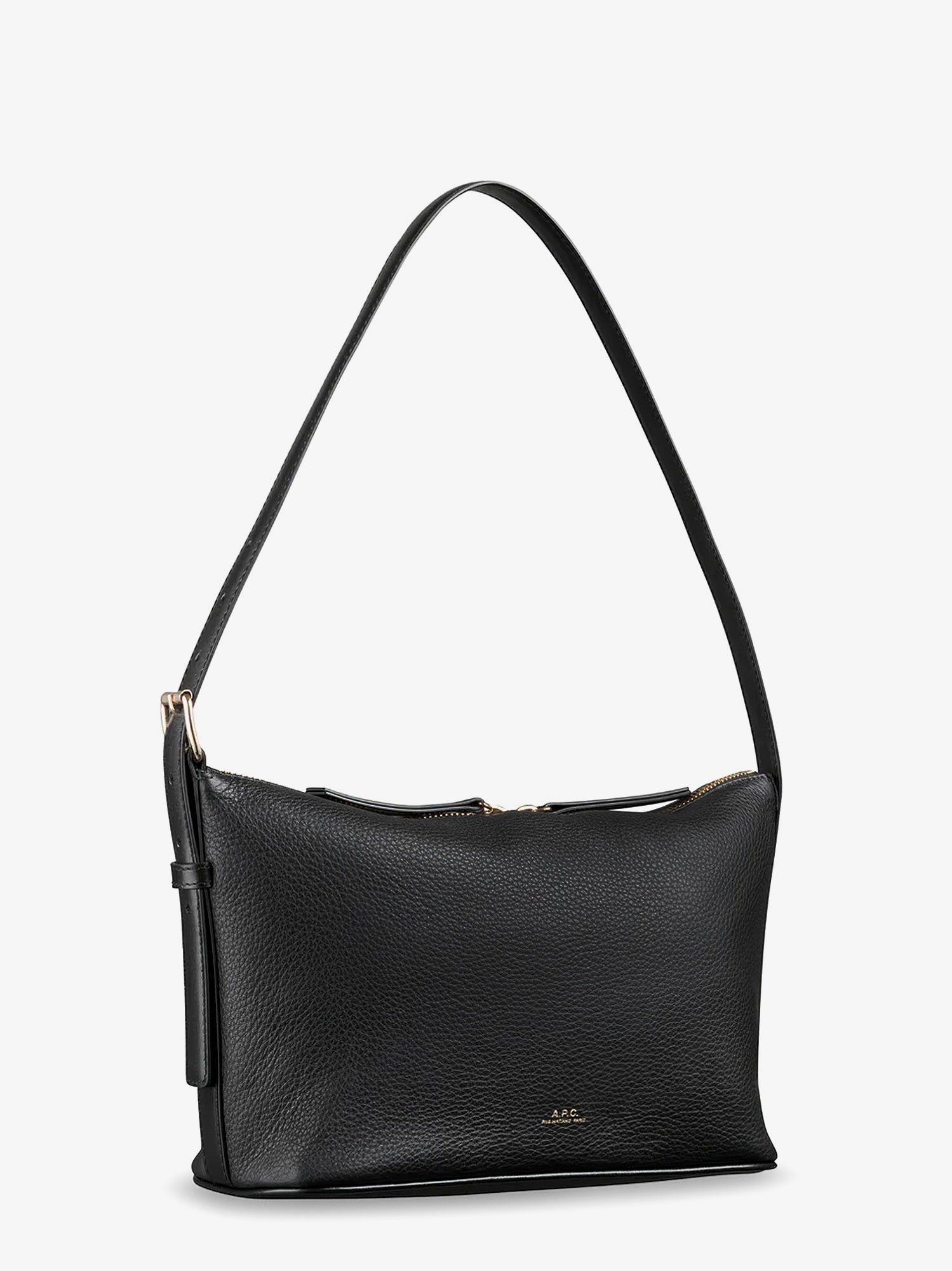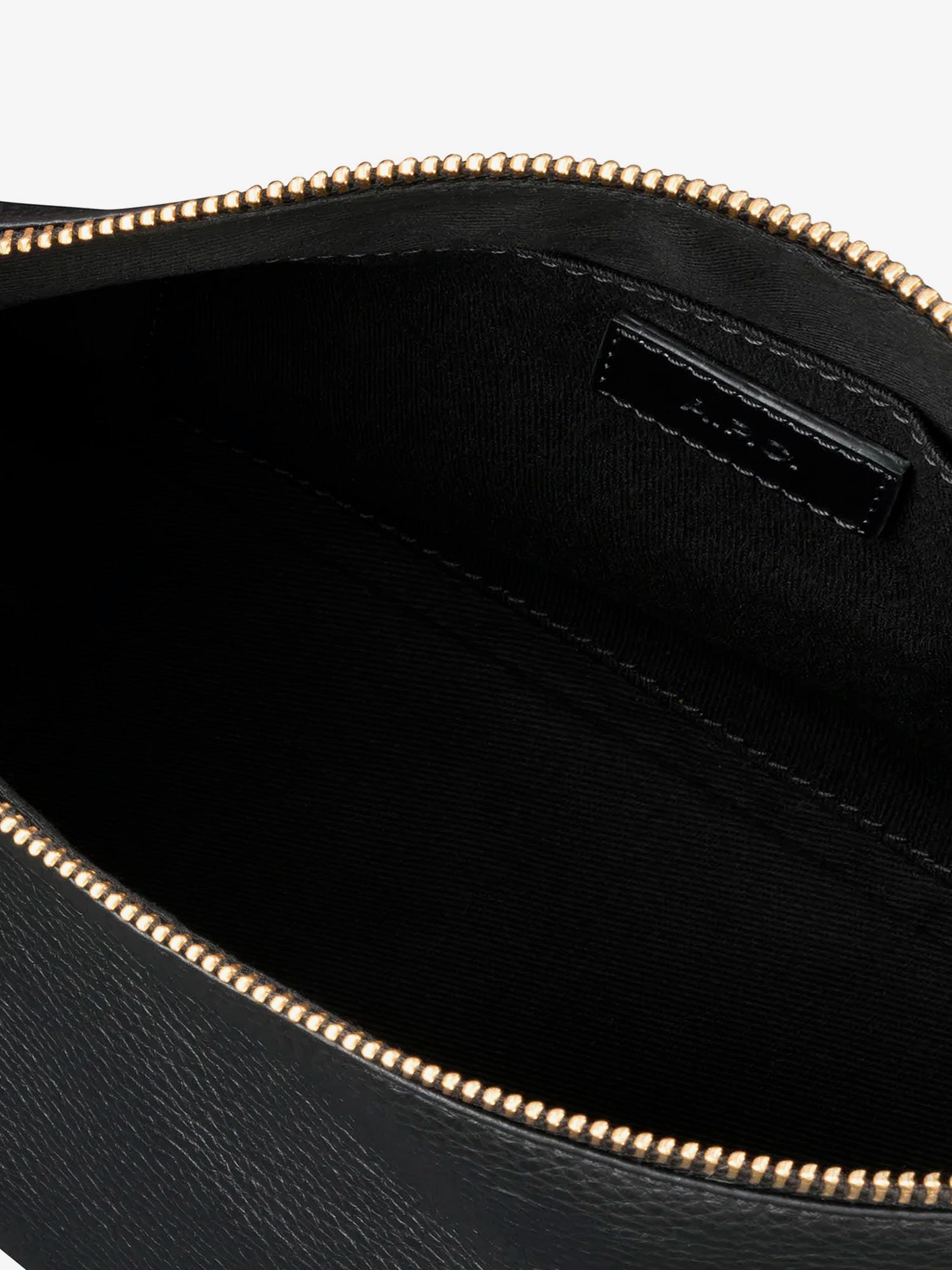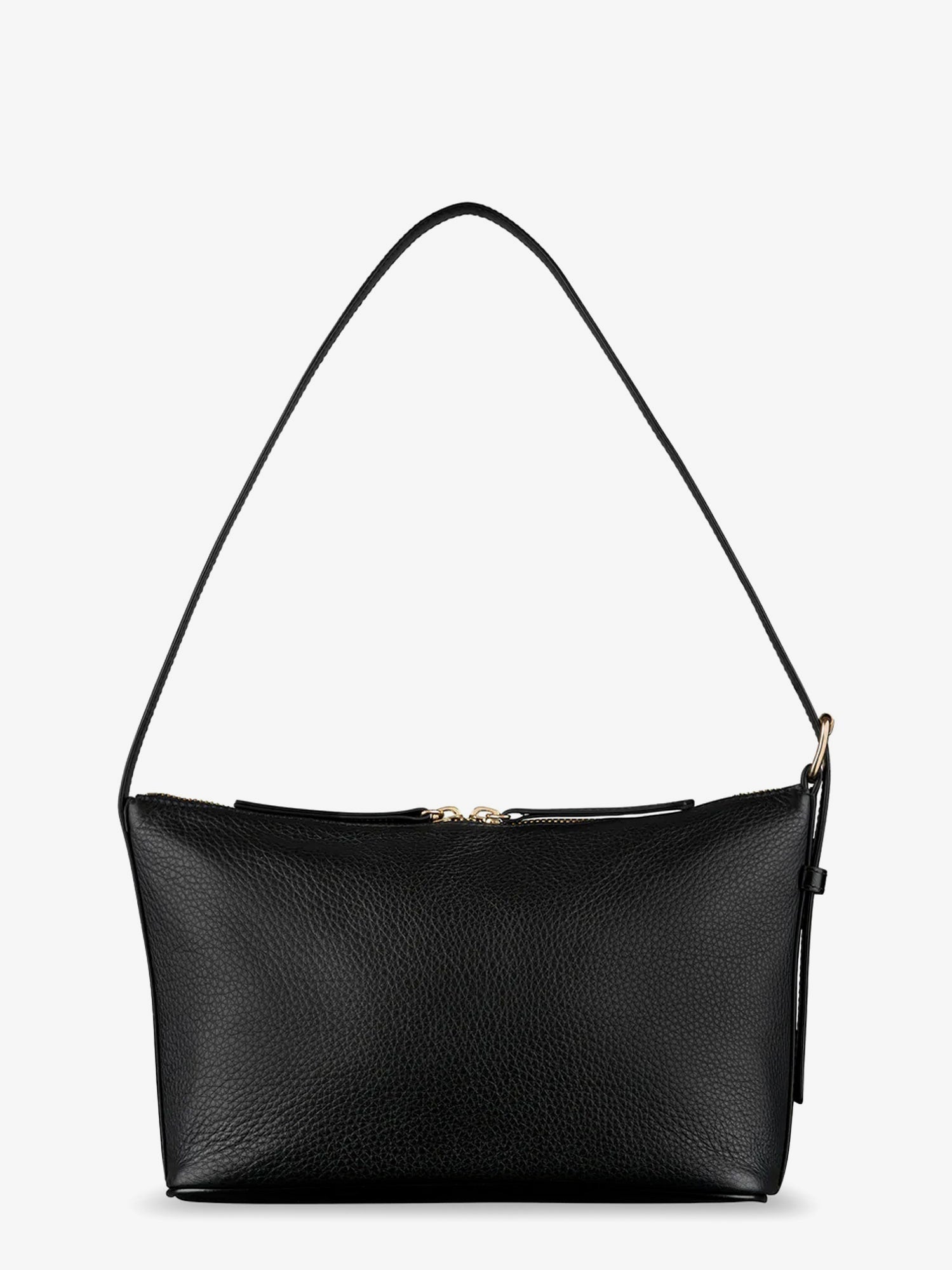 ' ジップ開閉式 フロントにロゴの刻印 調整可能なレザーショルダーストラップ 内側にフラットポケット1つ レザーライニングコットン W:29 cm x H: 16 cm x D: 9.5 cm '