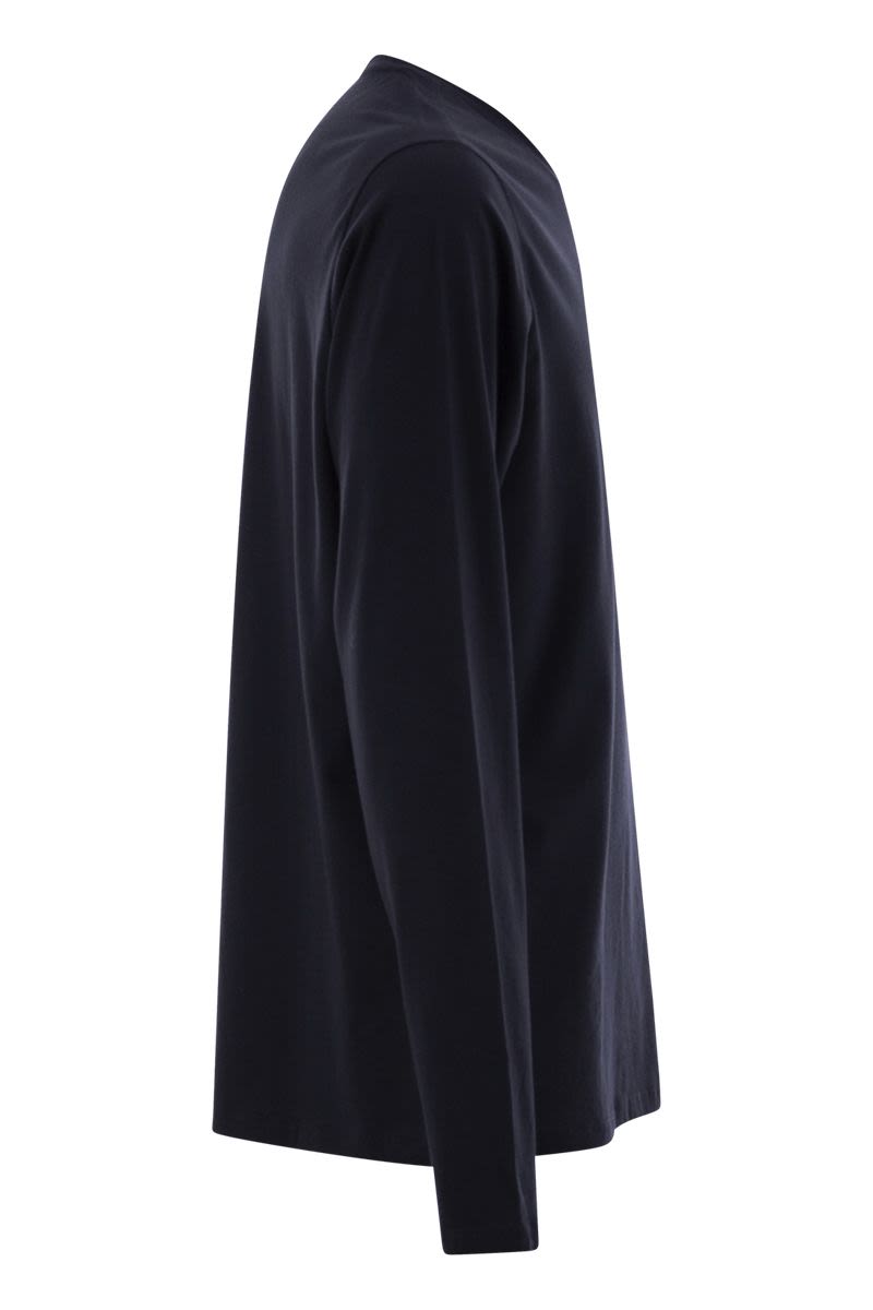 長袖でスリムフィットのベーシックなクルーネックTシャツ。コットンとエラスタンの組み合わせが、このシャツを貴重で快適なものにしている。エッセンシャルでベーシックな素材。最高級の繊維のみを使用した特別な織り方により、貴重でラグジュアリーな仕上がりになっている。コットンにエラスタン加工を施し、快適さと柔らかさをプラス。