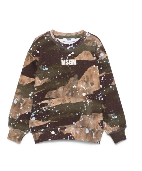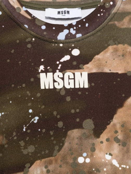 袖口と裾にオリーブブラウンのリブ、前身頃に抽象的なパターンとロゴプリント