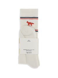 Autry x Maison KitsunEのソックスは、快適な履き心地とフィット感を実現するストレッチコットン混紡素材。2つのブランドのコラボレーションから生まれたエクスクルーシブなデザインは、ホワイトをベースにレッドとブルーのダブルストライプがアクセントを加え、スポーティで洗練されたタッチを添えている。