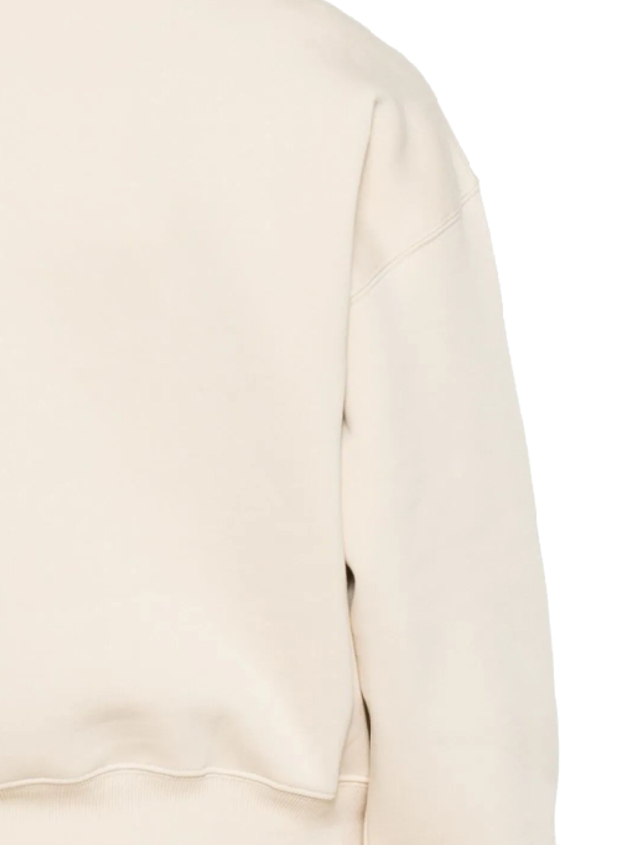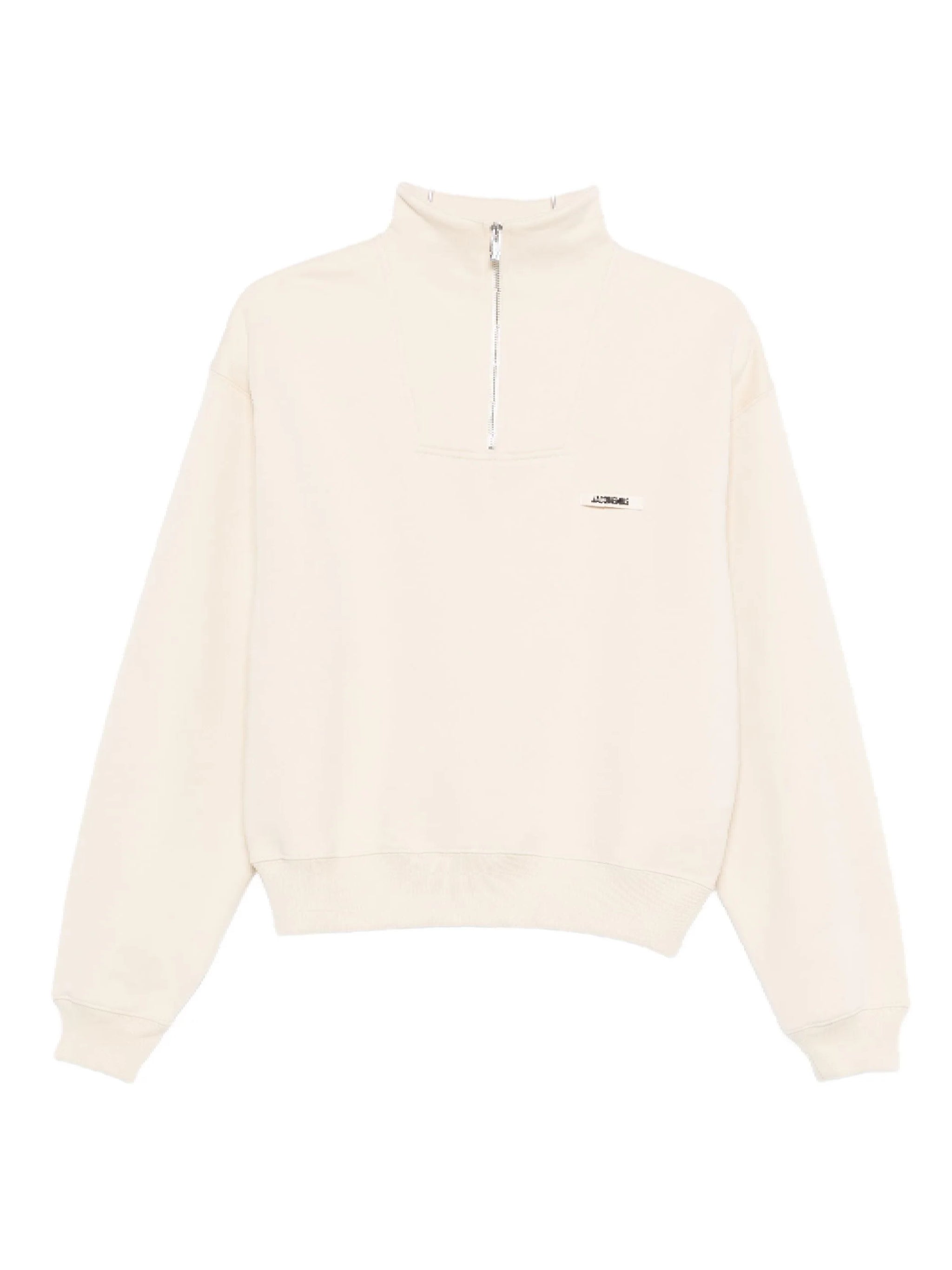 ライトベージュ ハーフフロントジップファスナー 長袖 胸にロゴパッチ 袖口と裾はリブ編み