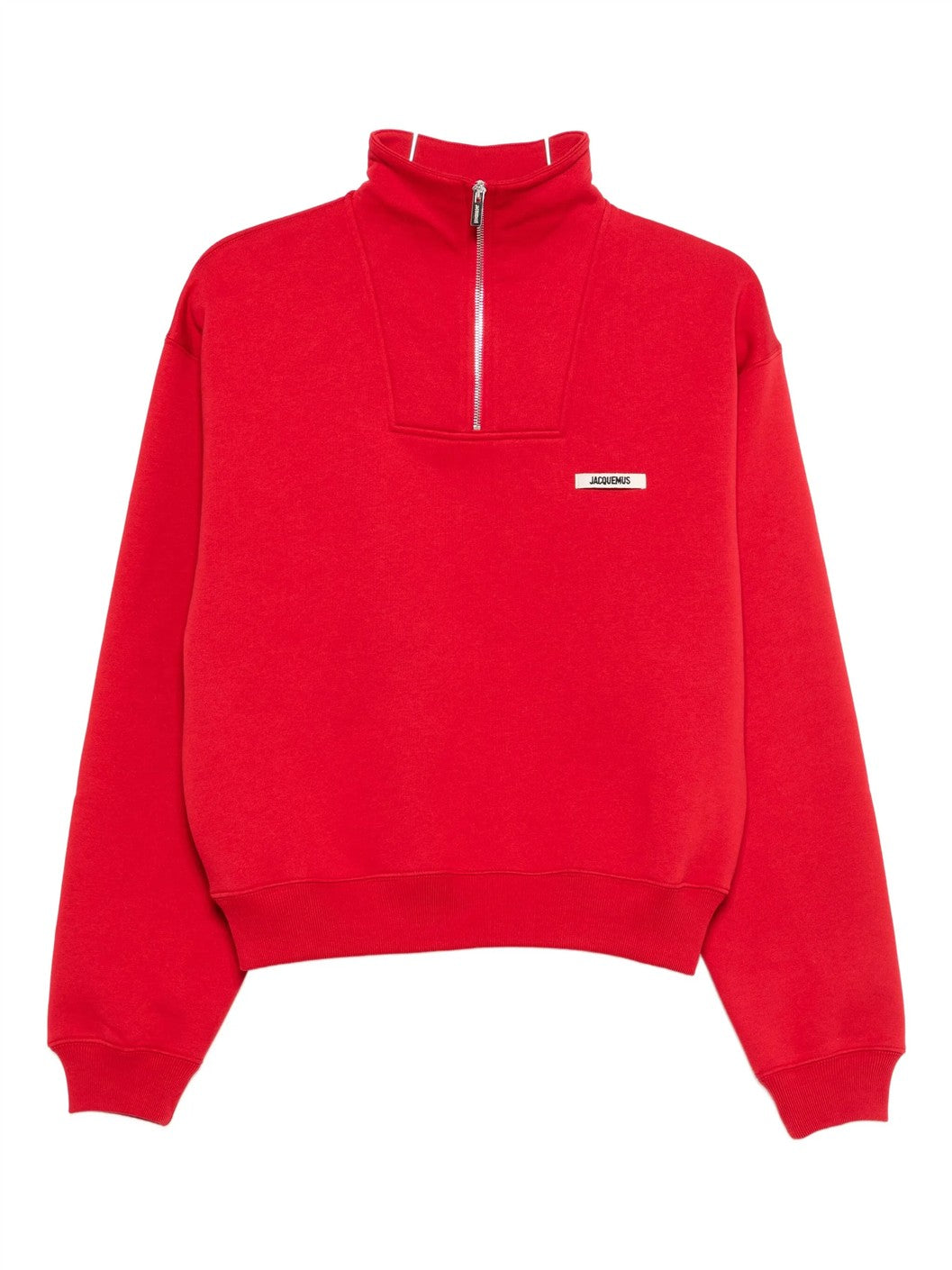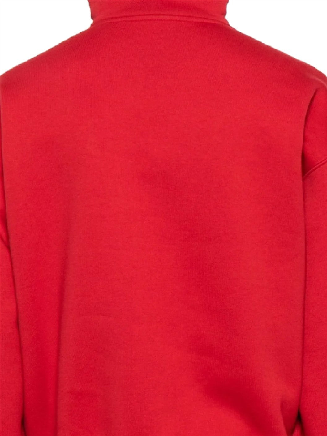 鮮やかなレッド ハーフフロント ジップファスナー 長袖 胸にロゴワッペン 袖口と裾にリブ付き