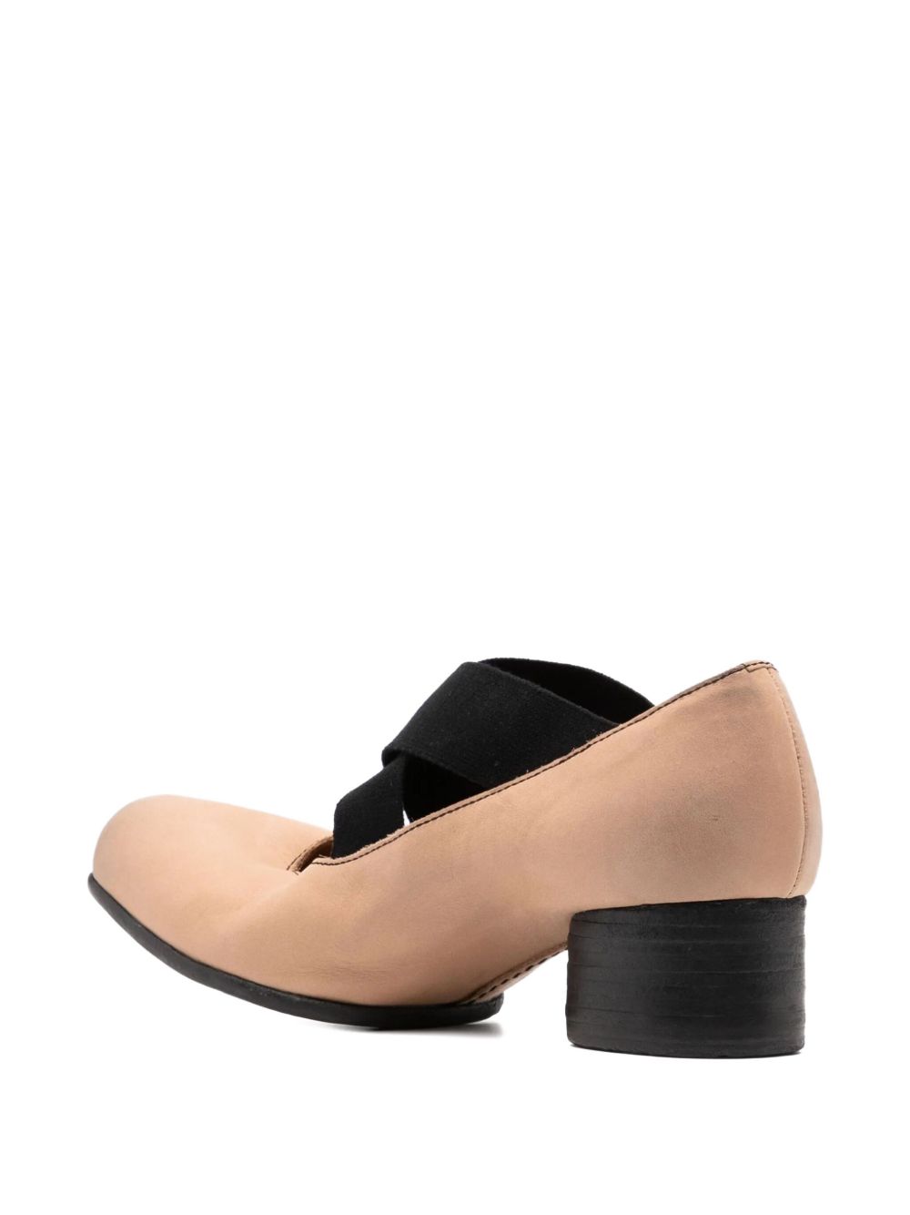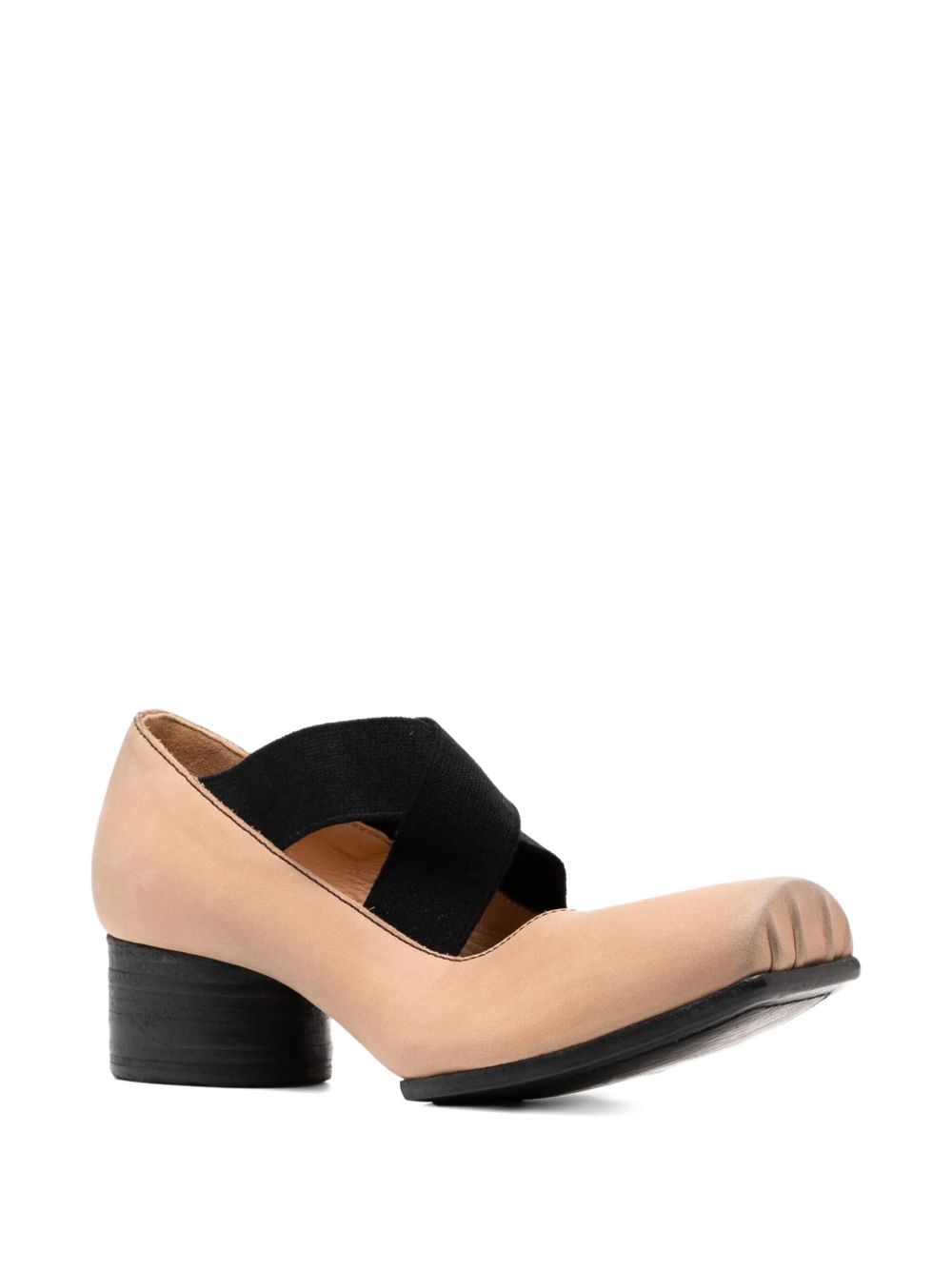 ピーチピンクスリッポンスタイルゴムストラップスクエアトゥローブロックヒール