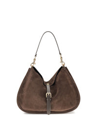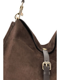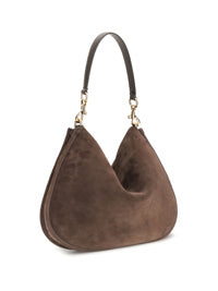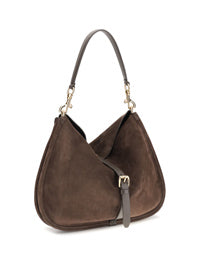 エトロの「ポニー」ショルダーバッグは、ソフトなラインとソリッドカラーのスエードのエレガンスが特徴です。ダブルクロージャーが特徴で、メインはETROのロゴとペガサスがコイン技法で刻印されたマグネットボタン、セカンダリーは機能的なメタルバックルです。ハンドルとショルダーストラップは付け替え可能で、スナップホックにはペイズリーのディテールがあしらわれています。