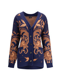 エトロのウールジャカードカーディガンは、ゆったりとしたフィットと花柄からインスパイアされたピアッツァート柄が特徴。温かみのあるジャカードウール製で、Vネック、ボタン留め、サイドパッチポケットが特徴です。オーバーフィットがリラックス感と洗練されたエレガンスを演出。