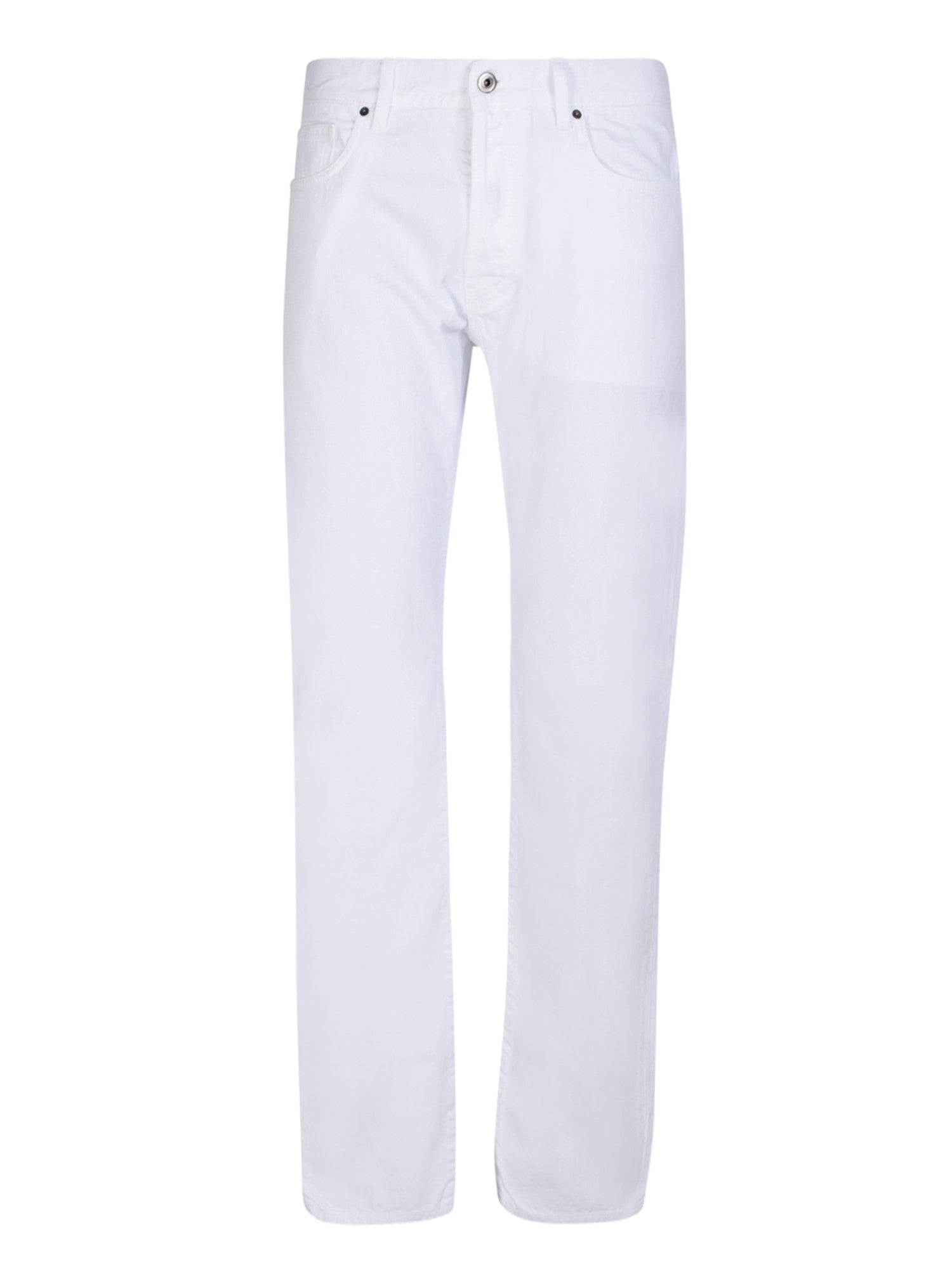 ミッドライズ。フロントボタンとジッパーで開閉。ベルトループ付き。クラシックな5ポケット。同系色のステッチ。レギュラーフィット。ストレートレッグ。裾はストレート。カラー:ホワイト