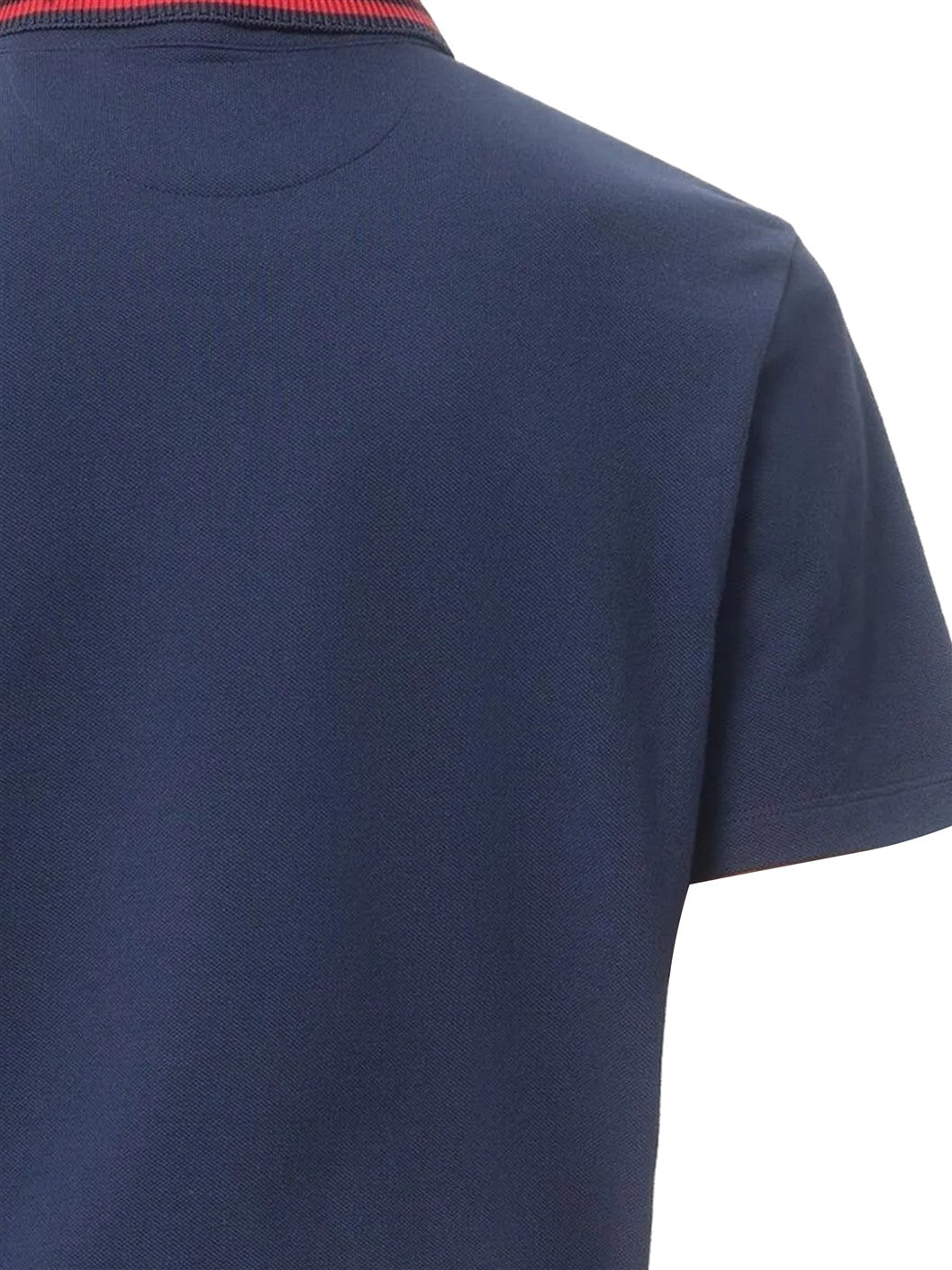 ミッドナイトブルーショートフロントボタン留めポロ襟胸パッチポケット胸に刺繍ロゴ