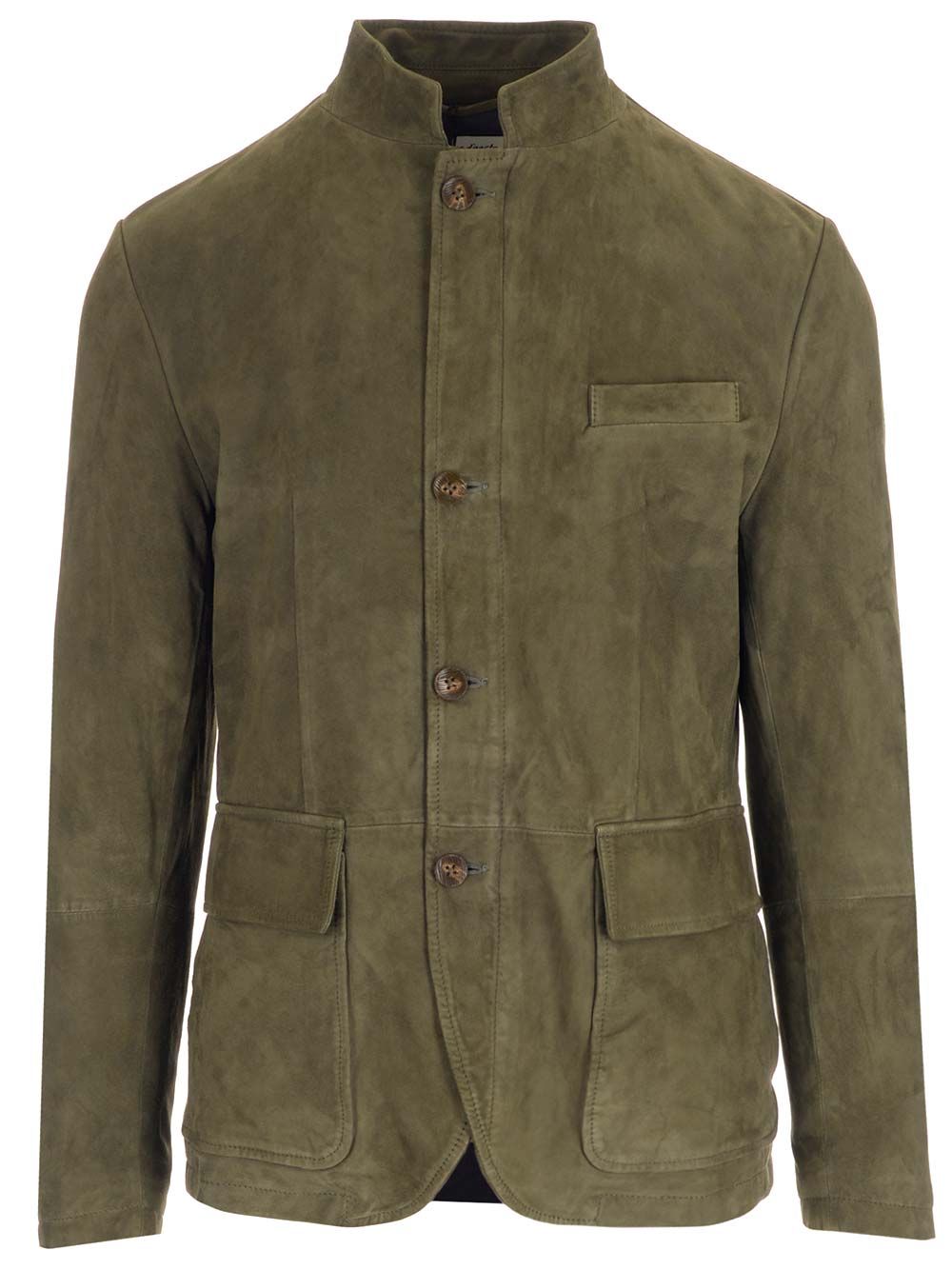 ボタン留めのオリーブグリーンのスエード・フィールドジャケット