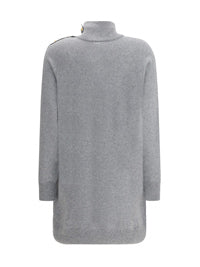 エコフレンドリーなカシミヤの柔らかさと、力強い個性が融合したBalmainのショートカシミヤセータードレス。メゾンのアイコニックな美学を際立たせる装飾的なライオンヘッドボタン。長いバットウィングスリーブとリブ仕上げが、洗練された現代的なシルエットを完成させている。