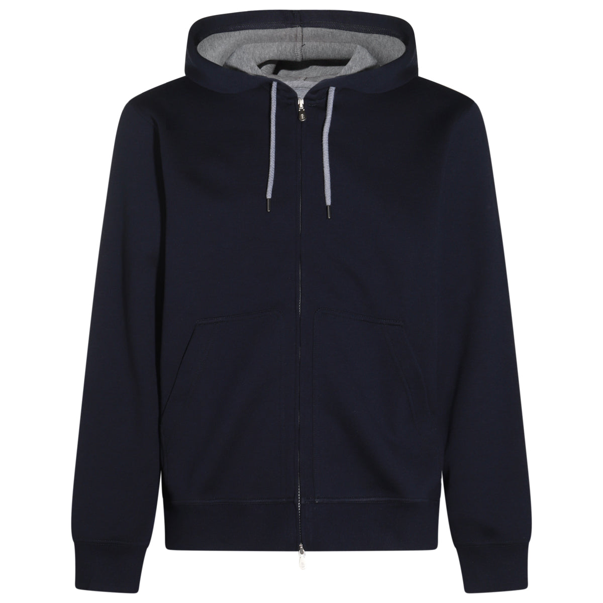 ブルネロクチネリからのブルーのコットンスウェットシャツです。長袖、ファスナー開閉、袖口と裾はリブ編み、フード付き。