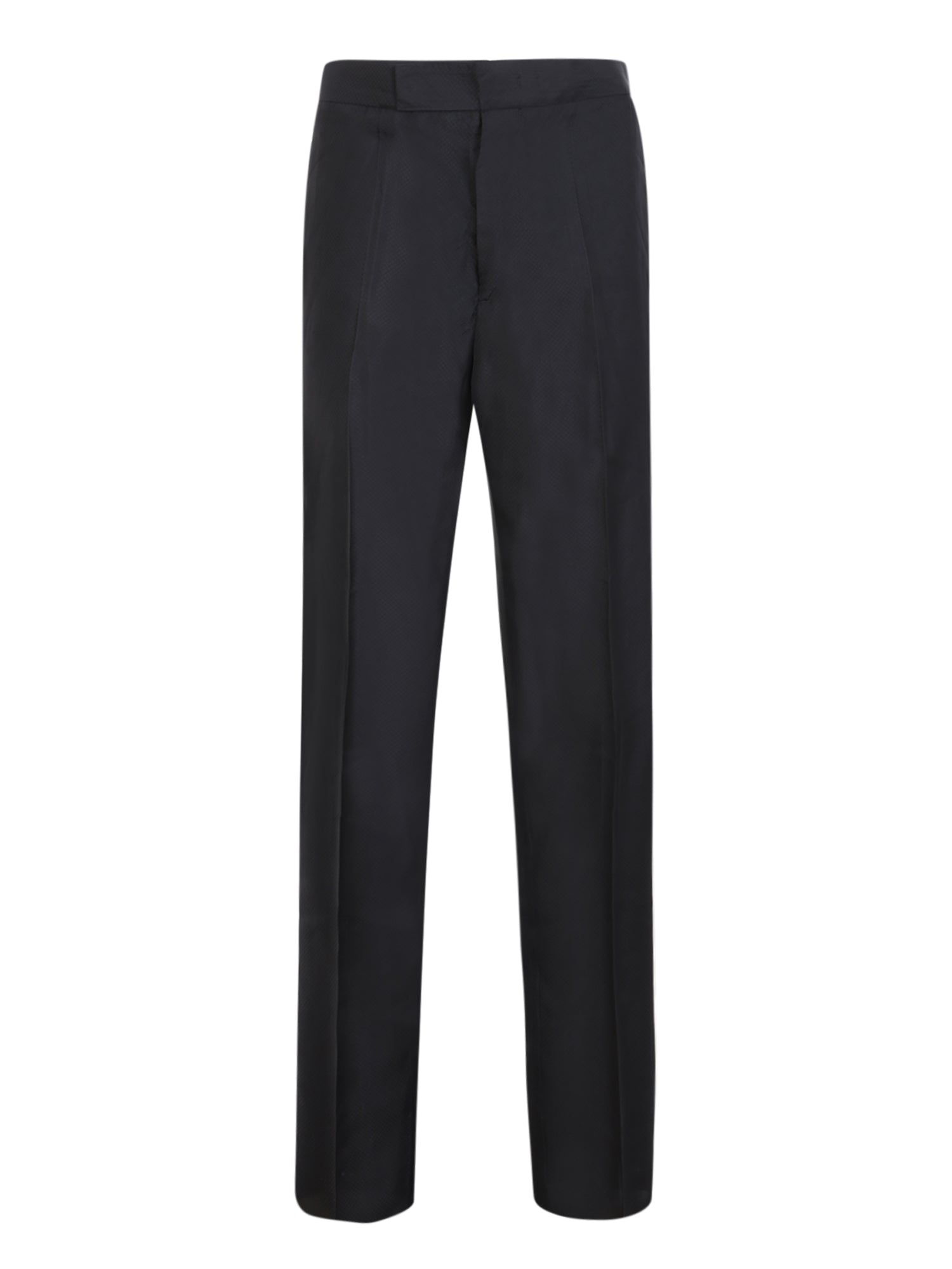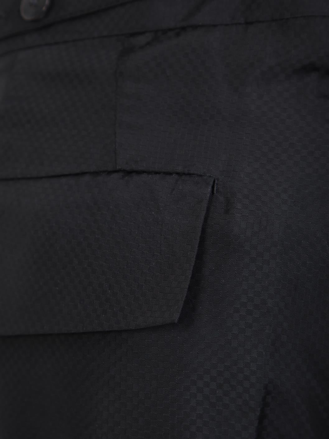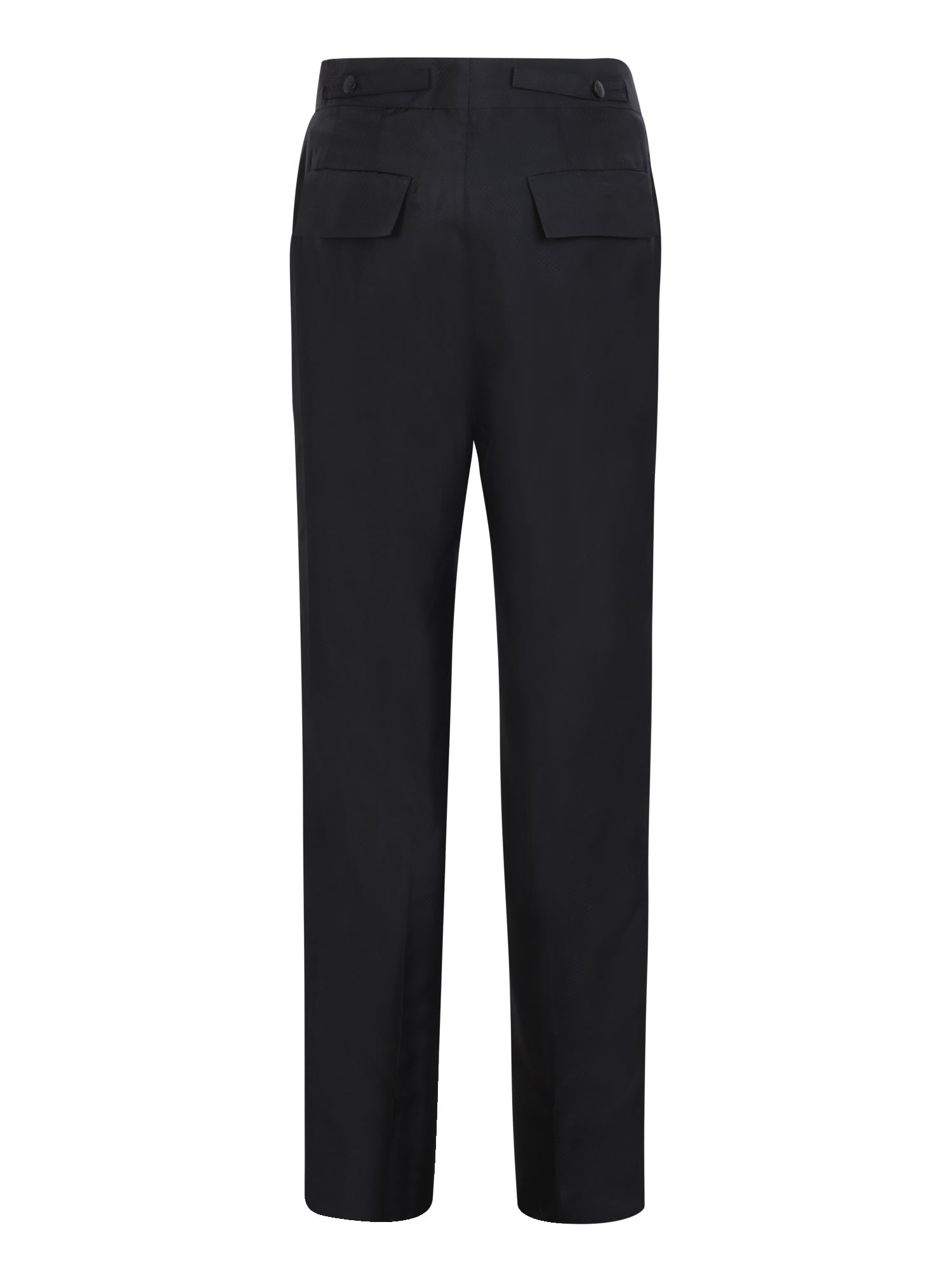 ハイウエスト。フロントはコンシールファスナー。両サイドにウェルトポケット。後ろフラップポケット2つ。ストレートカット。カラー: ブラック