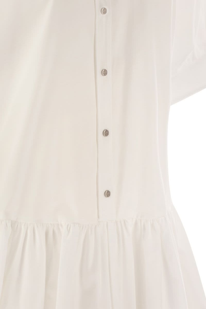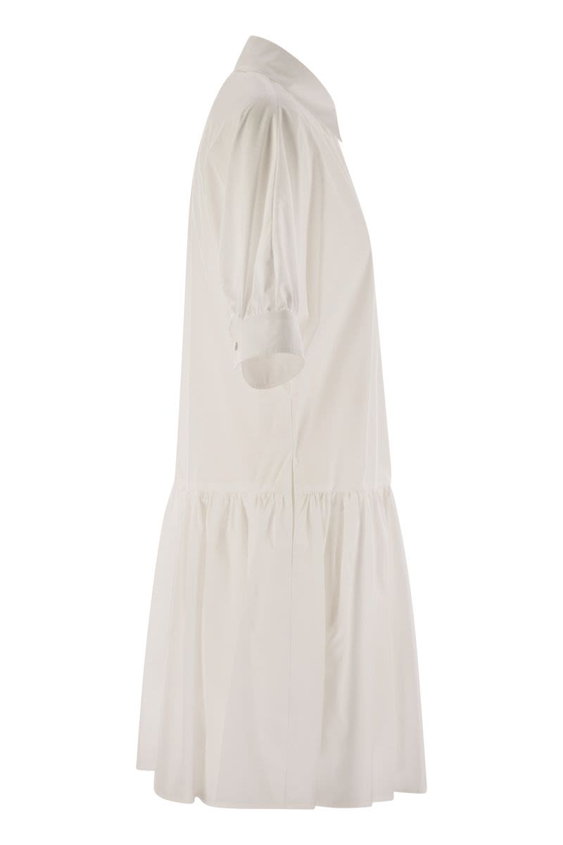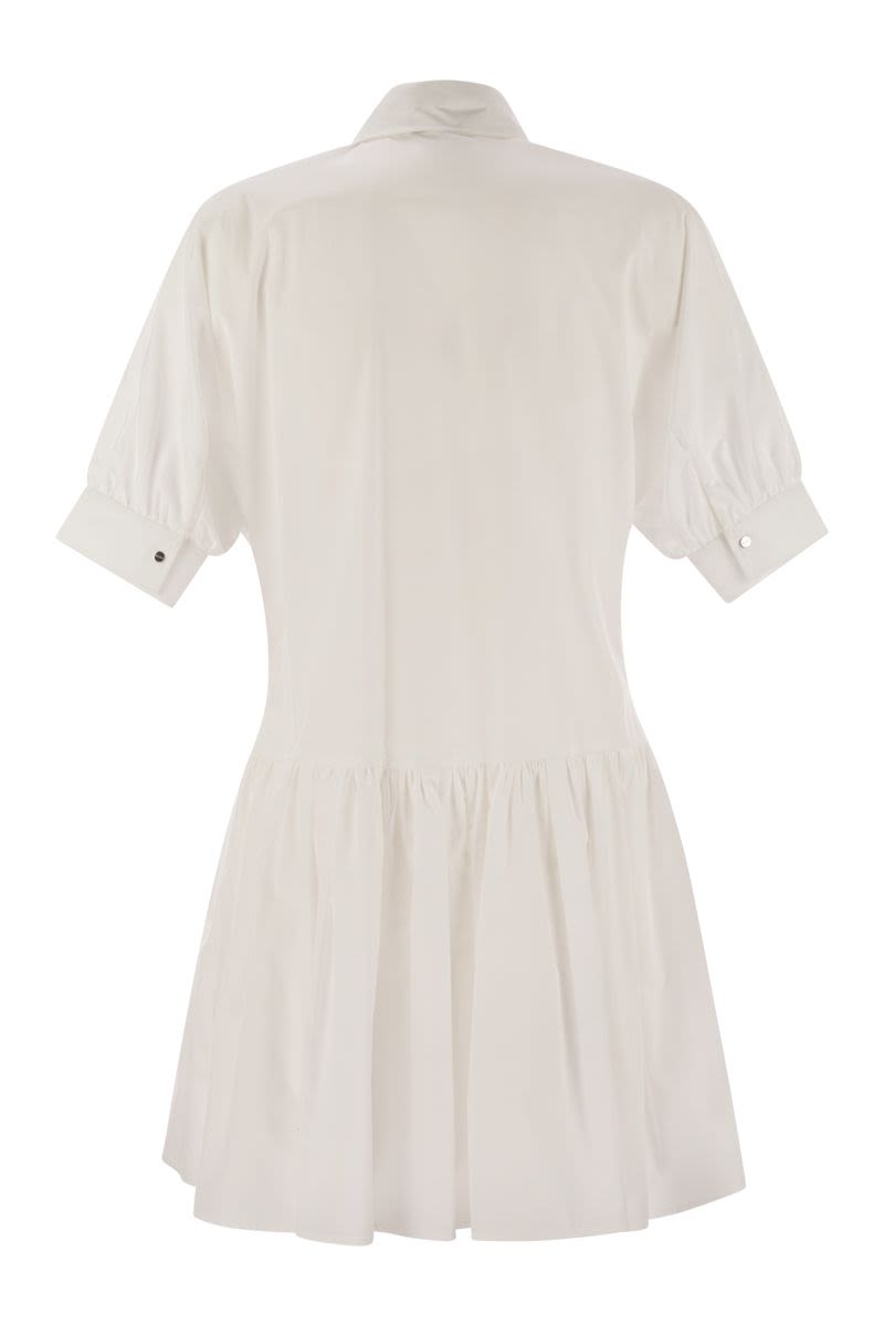 ソフトなピュアコットンポプリンのショート丈ケミシールドレス。ワイドなショートキモノスリーブ、ローカットのウエスト、裾のフラウンス柄が特徴。シャツカラーで仕上げられ、ポケットはヒップにタックが入っています。